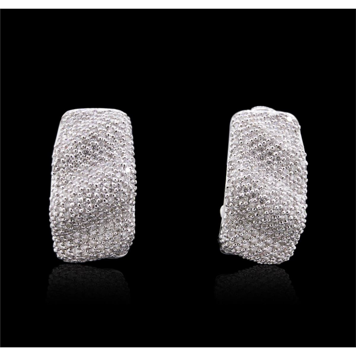 One pair electronically tested 18KT white gold ladies cast diamond earrings with Omega clip backs with posts with a bright polish finish. Identified with markings of "18K". Condition is new. Containing: Three Hundred Four prong set round brilliant cut diamonds, measuring 1.00 - 1.00 x 0.60mm (depth est.) approximate total weight of 304 Stones = 1.09ct. Clarity: SI-2 to I-1. Color: I - J, Cut is Good. All diamonds are graded in the mounting, unless otherwise stated. Total Weight of Diamonds 1.09ct. Total Weight of Earrings 8.50 grams. GGL Appraised at $4,465.00.