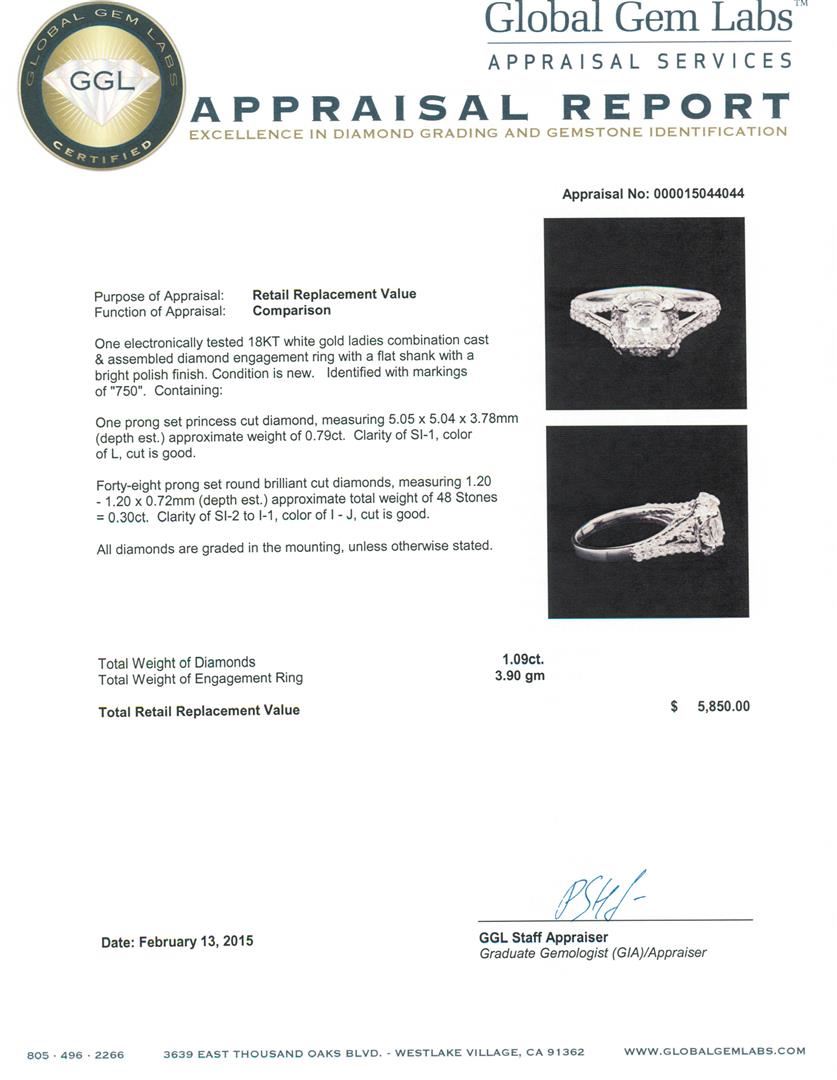One electronically tested 18KT white gold ladies combination cast & assembled diamond engagement ring with a flat shank with a bright polish finish. Identified with markings of "750". Condition is new. Containing: One prong set princess cut diamond, measuring 5.05 x 5.04 x 3.78mm (depth est.) approximate weight of 0.79ct. Clarity: SI-1. Color: L, Cut is Good. Forty-Eight prong set round brilliant cut diamonds, measuring 1.20 - 1.20 x 0.72mm (depth est.) approximate total weight of 48 Stones = 0.30ct. Clarity: SI-2 to I-1. Color: I - J, Cut is Good. All diamonds are graded in the mounting, unless otherwise stated. Total Weight of Diamonds 1.09ct. Total Weight of Engagement Ring 3.90 grams. GGL Appraised at $5,850.00.