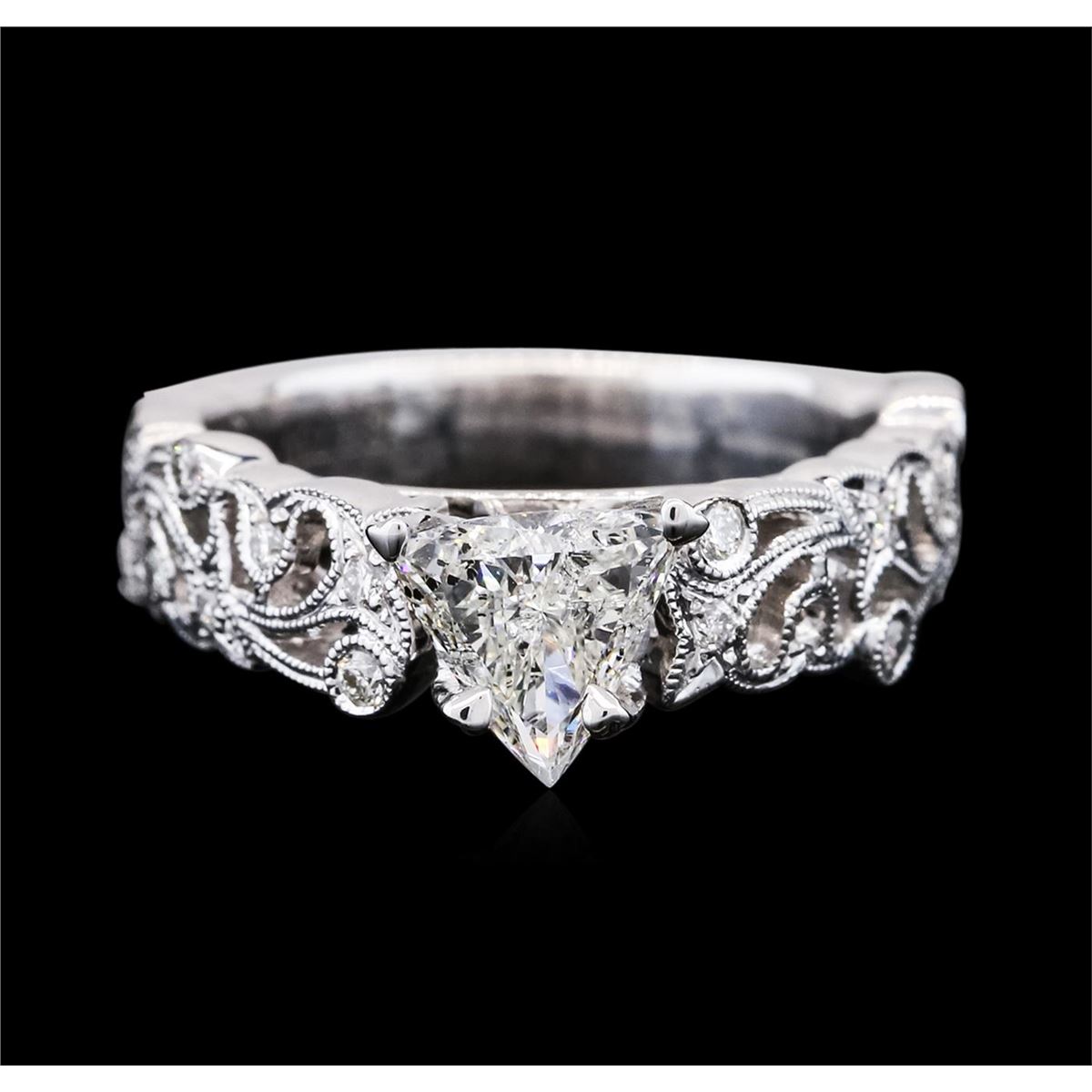 One electronically tested 18KT white gold ladies cast diamond engagement ring with a bright polish finish. Identified with markings of "18K". Condition is new. Containing: One prong set triangle brilliant cut diamond, measuring 6.50 x 6.50 x 4.03mm (depth est.) approximate weight of 0.97ct. Clarity: I-2. Color: J, Cut is Good. Eighteen prong set round brilliant cut diamonds, measuring 1.30 - 1.30 x 0.78mm (depth est.) approximate total weight of 18 Stones = 0.14ct. Clarity: SI-2 to I-1. Color: I - J, Cut is Good. All diamonds are graded in the mounting, unless otherwise stated. Total Weight of Diamonds 1.12ct. Total Weight of Ring 6.40 grams. GGL Appraised at $6,870.00.