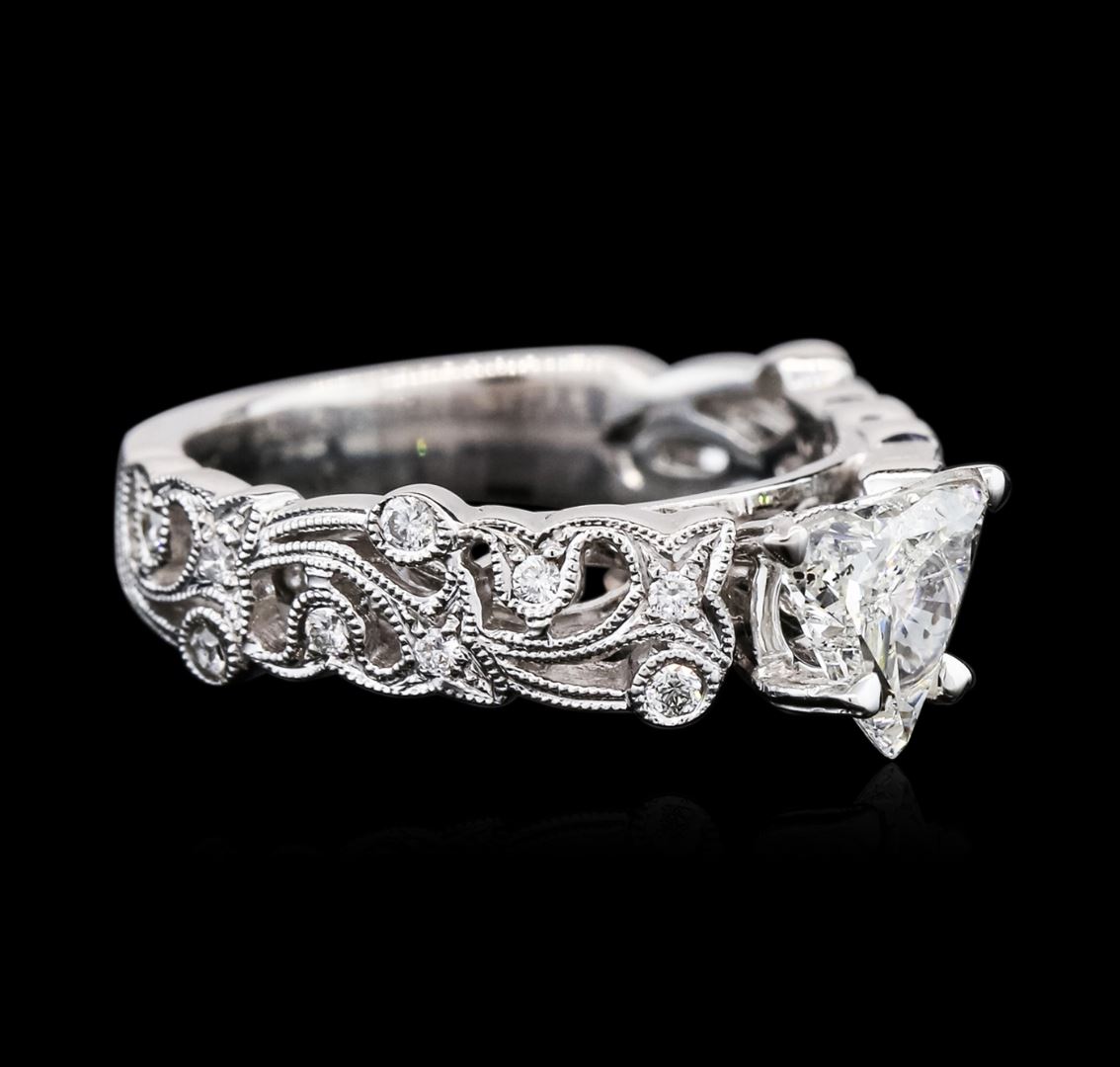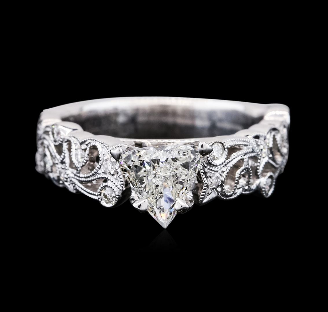 One electronically tested 18KT white gold ladies cast diamond engagement ring with a bright polish finish. Identified with markings of "18K". Condition is new. Containing: One prong set triangle brilliant cut diamond, measuring 6.50 x 6.50 x 4.03mm (depth est.) approximate weight of 0.97ct. Clarity: I-2. Color: J, Cut is Good. Eighteen prong set round brilliant cut diamonds, measuring 1.30 - 1.30 x 0.78mm (depth est.) approximate total weight of 18 Stones = 0.14ct. Clarity: SI-2 to I-1. Color: I - J, Cut is Good. All diamonds are graded in the mounting, unless otherwise stated. Total Weight of Diamonds 1.12ct. Total Weight of Ring 6.40 grams. GGL Appraised at $6,870.00.