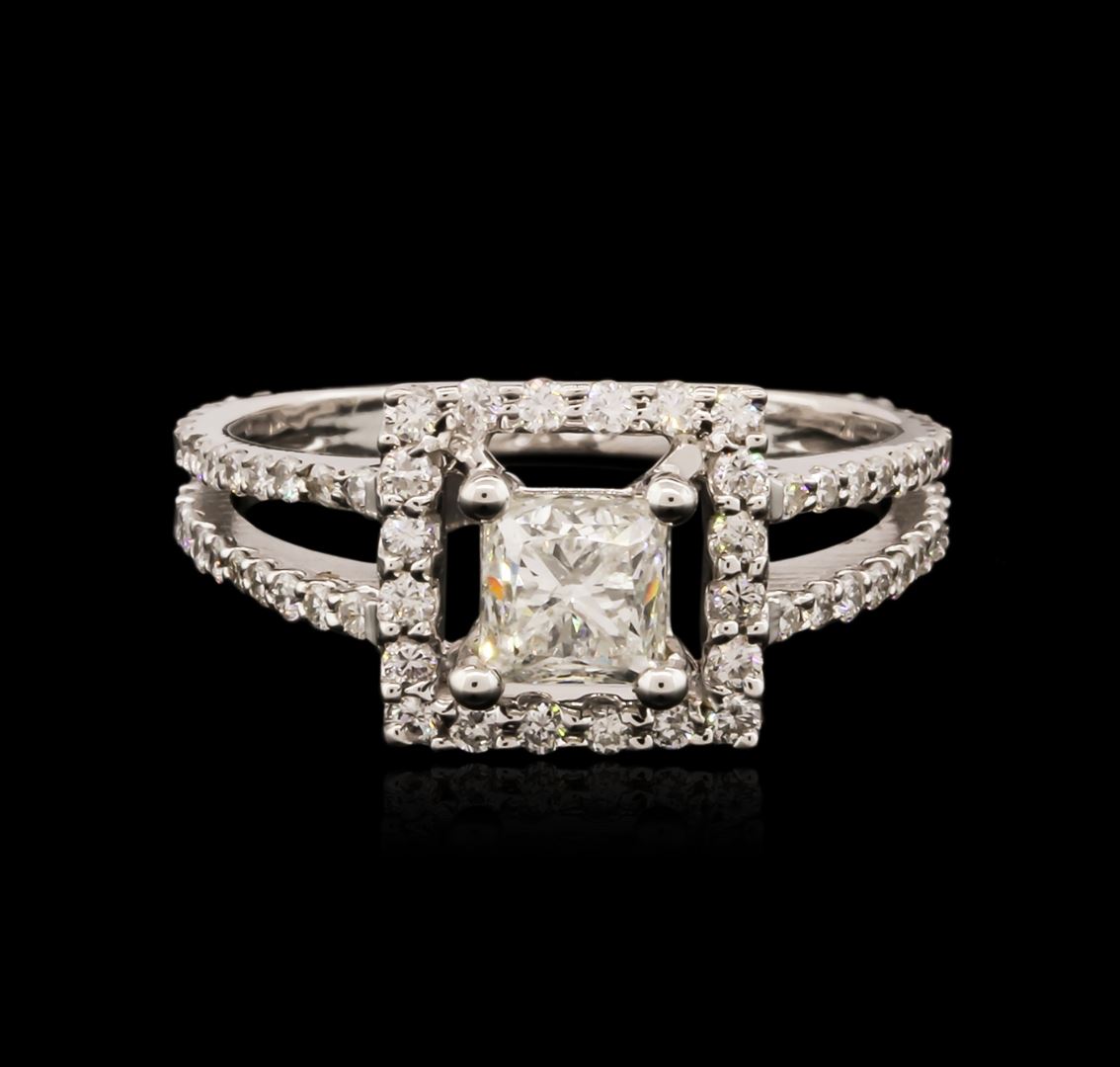 One electronically tested 18KT white gold ladies cast diamond engagement ring with a bright polish finish. Identified with markings of "18K". Condition is new. Containing: One prong set princess cut diamond, measuring 4.70 x 4.70 x 3.53mm (depth est.) approximate weight of 0.64ct. Clarity: I-1. Color: K, Cut is Good. Seventy-Six prong set round brilliant cut diamonds, measuring 1.20 - 1.20 x 0.72mm (depth est.) approximate total weight of 76 Stones = 0.48ct. Clarity: I-1 to I-2. Color: J, Cut is Good. All diamonds are graded in the mounting, unless otherwise stated. Total Weight of Diamonds 1.12ct. Total Weight of Engagement Ring 4.30 grams. GGL Appraised at $4,120.00.