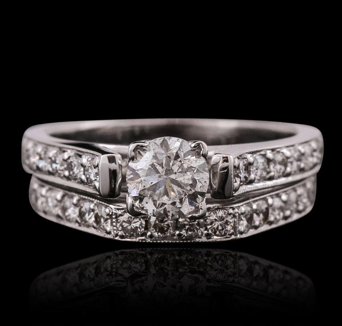 One electronically tested 18KT white gold ladies combination cast & assembled engagement ring soldered to wedding band with a flat shank with a bright polish finish. Condition is new. Containing: One prong set round brilliant cut diamond, measuring 5.36 - 5.30 x 3.20mm (depth est.) approximate weight of 0.56ct. Clarity: I-2. Color: I, Cut is Good. Twenty-Eight prong set triangle brilliant cut diamonds, measuring 1.80 x 1.80 x 1.12mm (depth est.) approximate total weight of 28 Stones = 0.58ct. Clarity: SI-1 to SI-2. Color: J, Cut is Good. All diamonds are graded in the mounting, unless otherwise stated. Total Weight of Diamonds 1.13ct. Total Weight of Ring Soldered To Wedding Band 6.60 grams. GGL Appraised at $7,200.00.