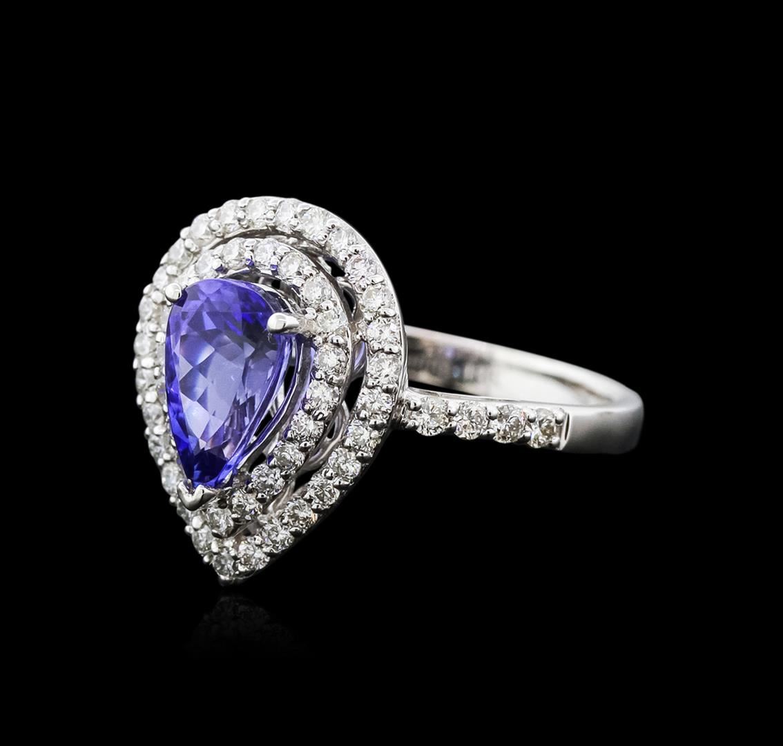 One electronically tested 18KT white gold ladies cast tanzanite and diamond ring with a half round shank with a bright polish finish. Identified with markings of "18K". Condition is new. Containing: One prong set pear modified brilliant cut natural tanzanite, measuring 9.00 x 6.00 x 3.18mm, approximate weight of 1.15ct., clarity is eye clean, type I, medium light, moderately strong, violet color, (GIA V 4/4), cut is good. Fifty-Two prong set round brilliant cut diamonds, measuring 1.30 - 1.30 x 0.78mm (depth est.) approximate total weight of 52 Stones = 0.42ct. Clarity: SI-2 to I-1. Color: I - J. All diamonds and colored gemstones are graded in the mounting, unless otherwise stated. Colored gemstones are presumed to have been subjected to commonly used enhancement processes. Total Weight of Colored Stones 1.15ct. Total Weight of Diamonds 0.42ct. Total Weight of Ring 4.30 grams. GGL Appraised at $4,020.00.
