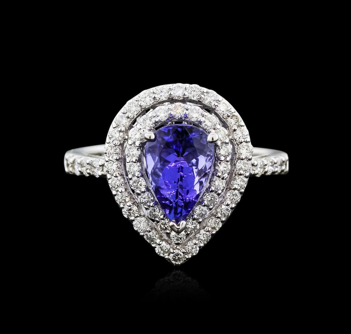 One electronically tested 18KT white gold ladies cast tanzanite and diamond ring with a half round shank with a bright polish finish. Identified with markings of "18K". Condition is new. Containing: One prong set pear modified brilliant cut natural tanzanite, measuring 9.00 x 6.00 x 3.18mm, approximate weight of 1.15ct., clarity is eye clean, type I, medium light, moderately strong, violet color, (GIA V 4/4), cut is good. Fifty-Two prong set round brilliant cut diamonds, measuring 1.30 - 1.30 x 0.78mm (depth est.) approximate total weight of 52 Stones = 0.42ct. Clarity: SI-2 to I-1. Color: I - J. All diamonds and colored gemstones are graded in the mounting, unless otherwise stated. Colored gemstones are presumed to have been subjected to commonly used enhancement processes. Total Weight of Colored Stones 1.15ct. Total Weight of Diamonds 0.42ct. Total Weight of Ring 4.30 grams. GGL Appraised at $4,020.00.