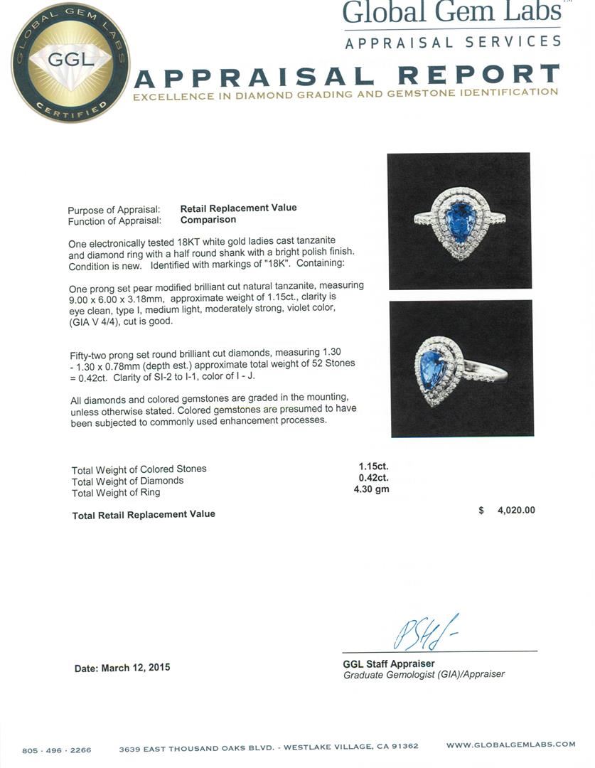 One electronically tested 18KT white gold ladies cast tanzanite and diamond ring with a half round shank with a bright polish finish. Identified with markings of "18K". Condition is new. Containing: One prong set pear modified brilliant cut natural tanzanite, measuring 9.00 x 6.00 x 3.18mm, approximate weight of 1.15ct., clarity is eye clean, type I, medium light, moderately strong, violet color, (GIA V 4/4), cut is good. Fifty-Two prong set round brilliant cut diamonds, measuring 1.30 - 1.30 x 0.78mm (depth est.) approximate total weight of 52 Stones = 0.42ct. Clarity: SI-2 to I-1. Color: I - J. All diamonds and colored gemstones are graded in the mounting, unless otherwise stated. Colored gemstones are presumed to have been subjected to commonly used enhancement processes. Total Weight of Colored Stones 1.15ct. Total Weight of Diamonds 0.42ct. Total Weight of Ring 4.30 grams. GGL Appraised at $4,020.00.