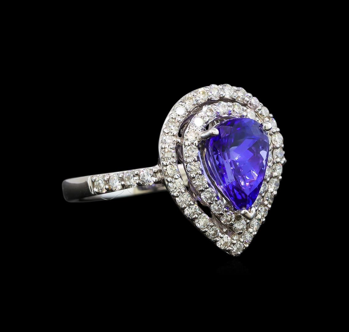 One electronically tested 18KT white gold ladies cast tanzanite and diamond ring with a half round shank with a bright polish finish. Identified with markings of "18K". Condition is new. Containing: One prong set pear modified brilliant cut natural tanzanite, measuring 9.00 x 6.00 x 3.18mm, approximate weight of 1.15ct., clarity is eye clean, type I, medium light, moderately strong, violet color, (GIA V 4/4), cut is good. Fifty-Two prong set round brilliant cut diamonds, measuring 1.30 - 1.30 x 0.78mm (depth est.) approximate total weight of 52 Stones = 0.42ct. Clarity: SI-2 to I-1. Color: I - J. All diamonds and colored gemstones are graded in the mounting, unless otherwise stated. Colored gemstones are presumed to have been subjected to commonly used enhancement processes. Total Weight of Colored Stones 1.15ct. Total Weight of Diamonds 0.42ct. Total Weight of Ring 4.30 grams. GGL Appraised at $4,020.00.