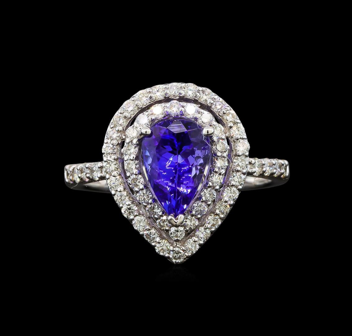 One electronically tested 18KT white gold ladies cast tanzanite and diamond ring with a half round shank with a bright polish finish. Identified with markings of "18K". Condition is new. Containing: One prong set pear modified brilliant cut natural tanzanite, measuring 9.00 x 6.00 x 3.18mm, approximate weight of 1.15ct., clarity is eye clean, type I, medium light, moderately strong, violet color, (GIA V 4/4), cut is good. Fifty-Two prong set round brilliant cut diamonds, measuring 1.30 - 1.30 x 0.78mm (depth est.) approximate total weight of 52 Stones = 0.42ct. Clarity: SI-2 to I-1. Color: I - J. All diamonds and colored gemstones are graded in the mounting, unless otherwise stated. Colored gemstones are presumed to have been subjected to commonly used enhancement processes. Total Weight of Colored Stones 1.15ct. Total Weight of Diamonds 0.42ct. Total Weight of Ring 4.30 grams. GGL Appraised at $4,020.00.