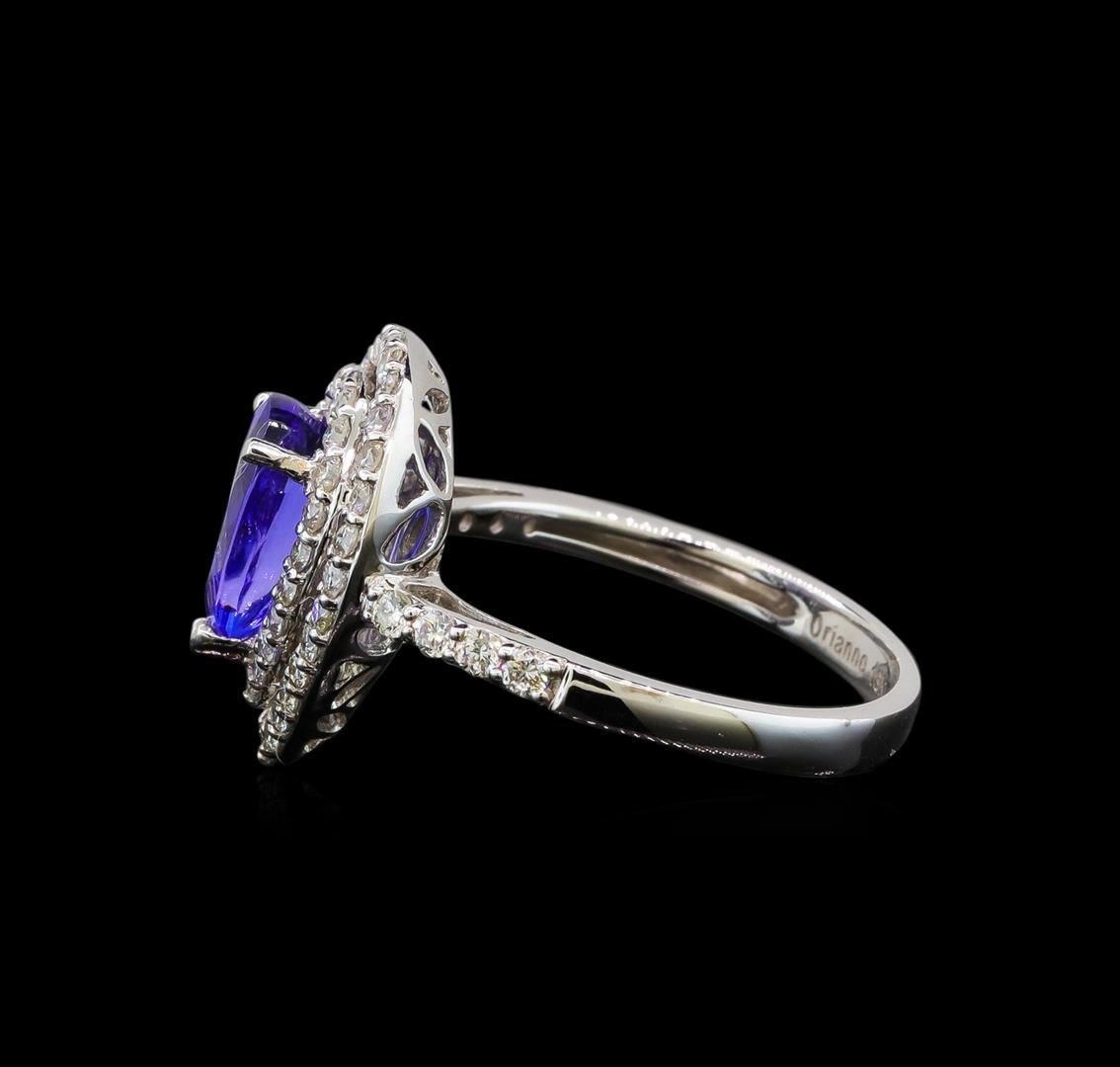 One electronically tested 18KT white gold ladies cast tanzanite and diamond ring with a half round shank with a bright polish finish. Identified with markings of "18K". Condition is new. Containing: One prong set pear modified brilliant cut natural tanzanite, measuring 9.00 x 6.00 x 3.18mm, approximate weight of 1.15ct., clarity is eye clean, type I, medium light, moderately strong, violet color, (GIA V 4/4), cut is good. Fifty-Two prong set round brilliant cut diamonds, measuring 1.30 - 1.30 x 0.78mm (depth est.) approximate total weight of 52 Stones = 0.42ct. Clarity: SI-2 to I-1. Color: I - J. All diamonds and colored gemstones are graded in the mounting, unless otherwise stated. Colored gemstones are presumed to have been subjected to commonly used enhancement processes. Total Weight of Colored Stones 1.15ct. Total Weight of Diamonds 0.42ct. Total Weight of Ring 4.30 grams. GGL Appraised at $4,020.00.