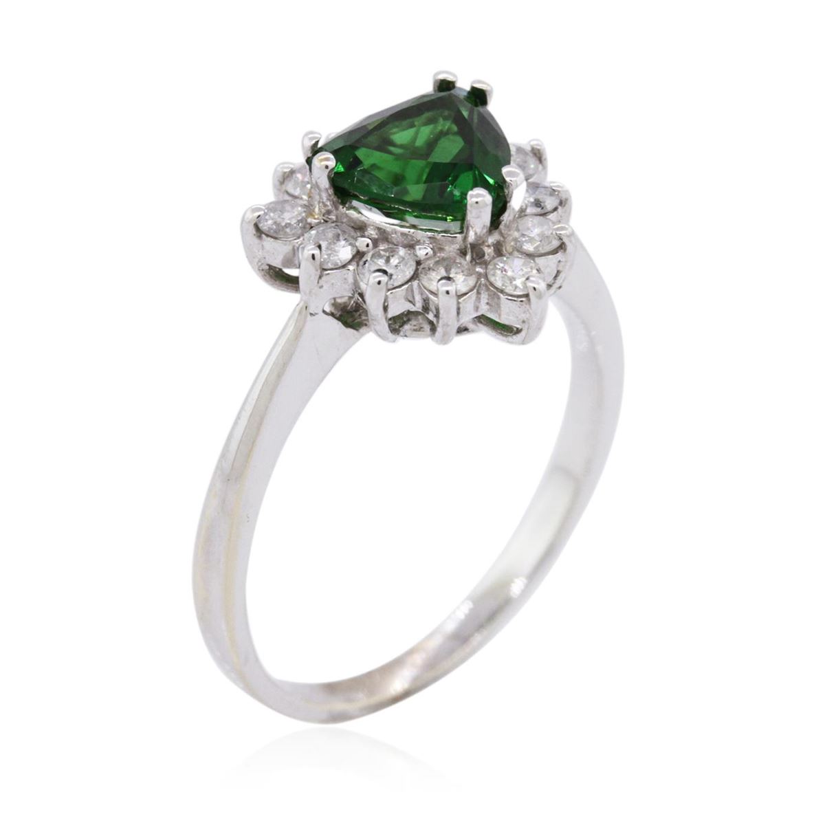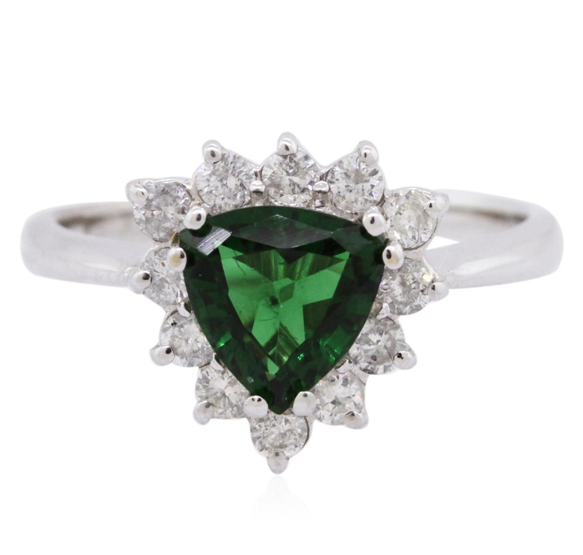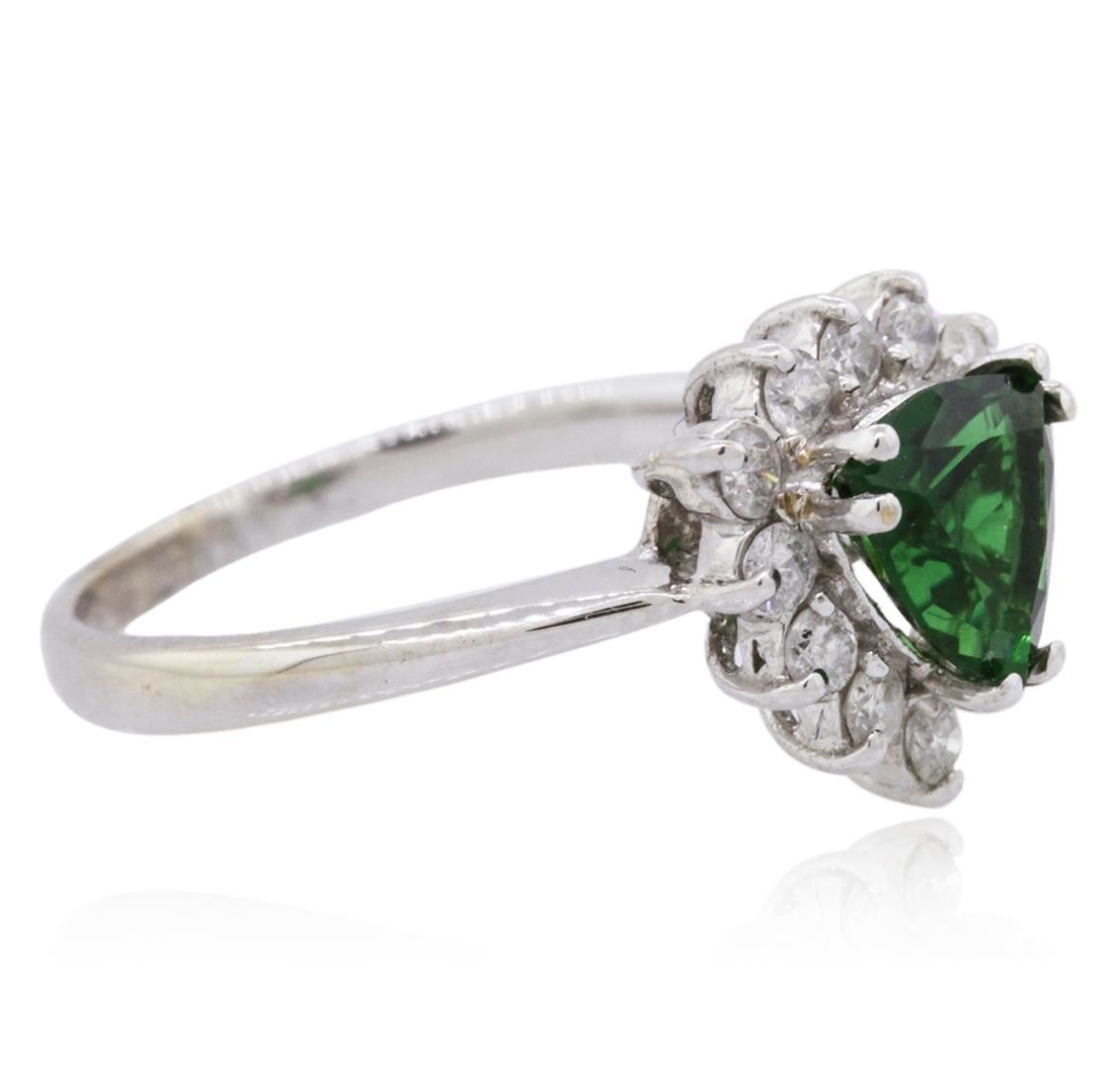 One electronically tested 18KT white gold ladies cast green tourmaline and diamond ring with a bright polish finish. The featured green tourmaline is set within a diamond bezel, completed by a one and one-half millimeter wide band. Identified with markings of "18K". Condition is new, good workmanship. Containing: One prong set triangle mixed cut natural green tourmaline, measuring 7.40 x 7.20 x 3.70mm, 6%. bulge factor, approximate weight of 1.15ct., clarity is eye clean, type I, dark, very slightly grayish, green color, (GIA G 7/3), cut is good. Transmitting light with no distortion, transparent. Graded in the setting. Twelve prong set round brilliant cut diamonds, measuring 2.20 - 2.10 x 1.29mm (depth est.) approximate total weight of 12 Stones = 0.53ct. Graded in the setting. Clarity: I-1 to I-2. Color: F - H. Total Weight of Colored Stones 1.15ct. Total Weight of Diamonds 0.53ct. Total Weight of Ring 3.84 grams. AIG Appraised at $2,245.00.