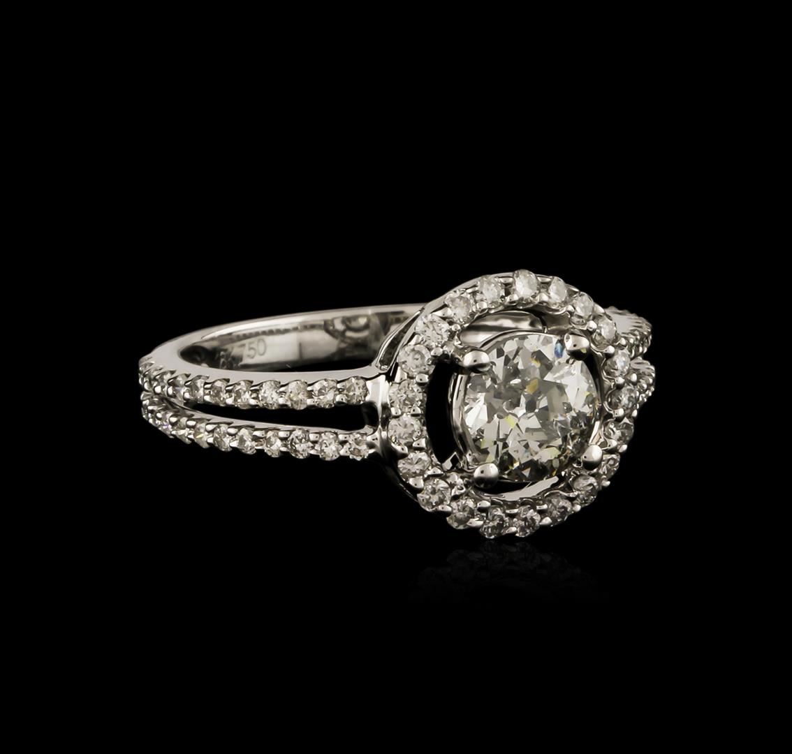 One electronically tested 18KT white gold ladies cast diamond engagement ring with a bright polish finish. Identified with markings of "18K". Condition is new. Containing: One prong set Old European cut diamond, measuring 6.30 - 6.30 x 3.48mm (depth est.) approximate weight of 0.84ct. Clarity: I-2. Color: K. Fifty-Two prong set round brilliant cut diamonds, measuring 1.20 - 1.20 x 0.72mm (depth est.) approximate total weight of 52 Stones = 0.33ct. Clarity: SI-2 to I-1. Color: I, Cut is Good. All diamonds are graded in the mounting, unless otherwise stated. Total Weight of Diamonds 1.17ct. Total Weight of Engagement Ring 4.00 grams. GGL Appraised at $4,700.00.