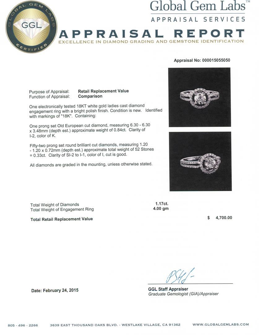 One electronically tested 18KT white gold ladies cast diamond engagement ring with a bright polish finish. Identified with markings of "18K". Condition is new. Containing: One prong set Old European cut diamond, measuring 6.30 - 6.30 x 3.48mm (depth est.) approximate weight of 0.84ct. Clarity: I-2. Color: K. Fifty-Two prong set round brilliant cut diamonds, measuring 1.20 - 1.20 x 0.72mm (depth est.) approximate total weight of 52 Stones = 0.33ct. Clarity: SI-2 to I-1. Color: I, Cut is Good. All diamonds are graded in the mounting, unless otherwise stated. Total Weight of Diamonds 1.17ct. Total Weight of Engagement Ring 4.00 grams. GGL Appraised at $4,700.00.