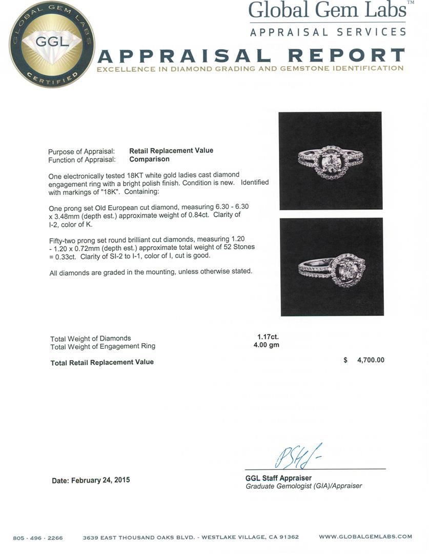 One electronically tested 18KT white gold ladies cast diamond engagement ring with a bright polish finish. Identified with markings of "18K". Condition is new. Containing: One prong set Old European cut diamond, measuring 6.30 - 6.30 x 3.48mm (depth est.) approximate weight of 0.84ct. Clarity: I-2. Color: K. Fifty-Two prong set round brilliant cut diamonds, measuring 1.20 - 1.20 x 0.72mm (depth est.) approximate total weight of 52 Stones = 0.33ct. Clarity: SI-2 to I-1. Color: I, Cut is Good. All diamonds are graded in the mounting, unless otherwise stated. Total Weight of Diamonds 1.17ct. Total Weight of Engagement Ring 4.00 grams. GGL Appraised at $4,700.00.