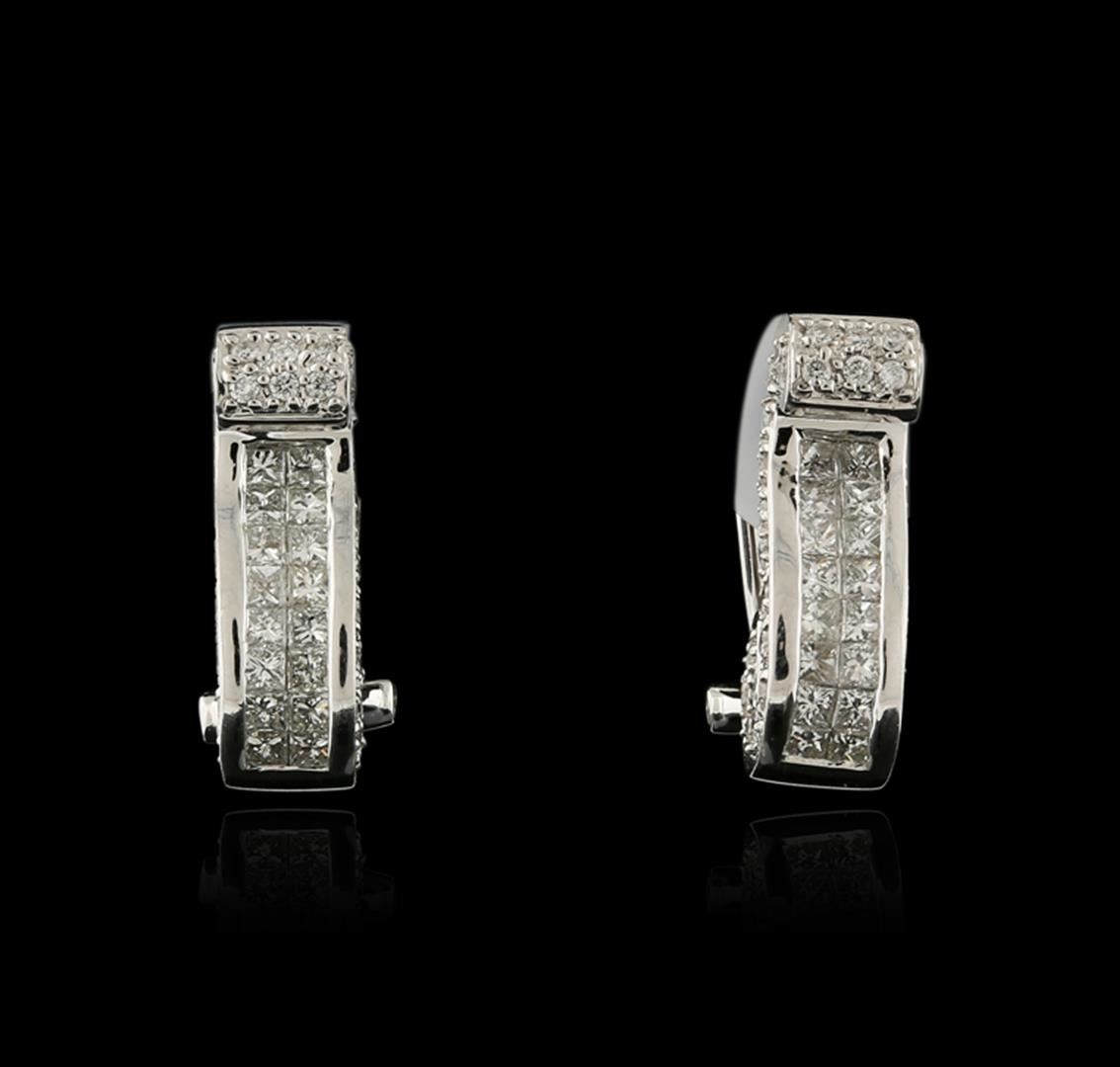 One pair electronically tested 18KT white gold ladies cast diamond earrings with friction posts with a bright polish finish. Identified with markings of "18K". Condition is new. Containing: Two bezel set round brilliant cut diamonds, measuring 5.50 - 5.50 x 3.30mm (depth est.) approximate total weight of 2 Stones = 1.22ct. Clarity: SI-2 to I-1. Color: I - J, Cut is Good. Ninety-Six prong set round brilliant cut diamonds, measuring 1.30 - 1.00 x 0.69mm (depth est.) approximate total weight of 96 Stones = 0.53ct. Clarity: SI-1 to SI-2. Color: I - J, Cut is Good. All diamonds are graded in the mounting, unless otherwise stated. Total Weight of Diamonds 1.75ct. Total Weight of Earrings 4.00 grams. GGL Appraised at $6,470.00.
