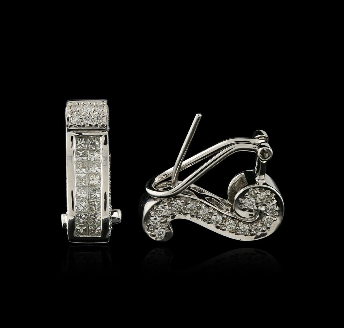 One pair electronically tested 18KT white gold ladies cast diamond earrings with friction posts with a bright polish finish. Identified with markings of "18K". Condition is new. Containing: Two bezel set round brilliant cut diamonds, measuring 5.50 - 5.50 x 3.30mm (depth est.) approximate total weight of 2 Stones = 1.22ct. Clarity: SI-2 to I-1. Color: I - J, Cut is Good. Ninety-Six prong set round brilliant cut diamonds, measuring 1.30 - 1.00 x 0.69mm (depth est.) approximate total weight of 96 Stones = 0.53ct. Clarity: SI-1 to SI-2. Color: I - J, Cut is Good. All diamonds are graded in the mounting, unless otherwise stated. Total Weight of Diamonds 1.75ct. Total Weight of Earrings 4.00 grams. GGL Appraised at $6,470.00.