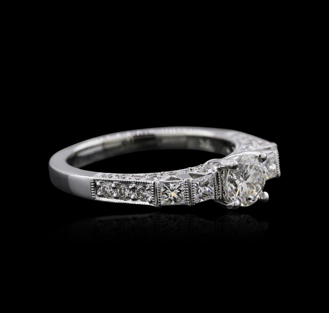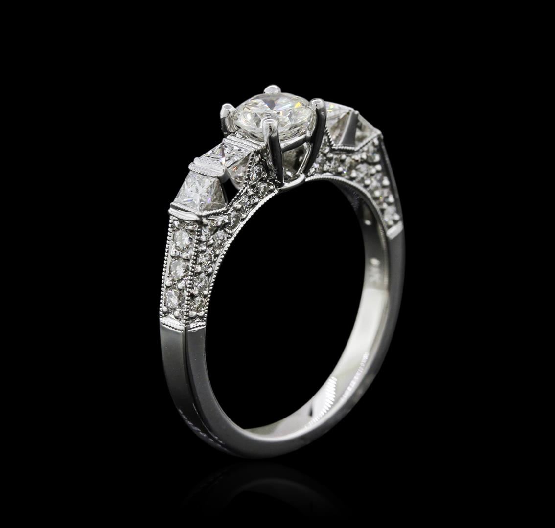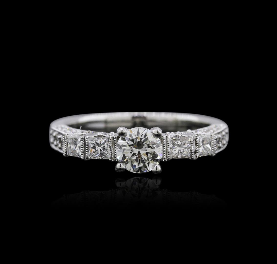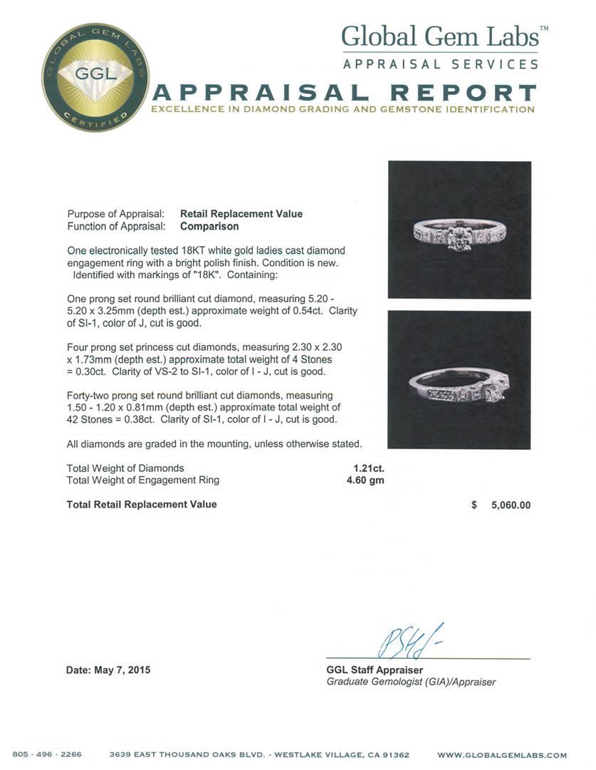 One electronically tested 18KT white gold ladies cast diamond engagement ring with a bright polish finish. Identified with markings of "18K". Condition is new. Containing: One prong set round brilliant cut diamond, measuring 5.20 - 5.20 x 3.25mm (depth est.) approximate weight of 0.54ct. Clarity: SI-1. Color: J, Cut is Good. Four prong set princess cut diamonds, measuring 2.30 x 2.30 x 1.73mm (depth est.) approximate total weight of 4 Stones = 0.30ct. Clarity: VS-2 to SI-1. Color: I - J, Cut is Good. Forty-Two prong set round brilliant cut diamonds, measuring 1.50 - 1.20 x 0.81mm (depth est.) approximate total weight of 42 Stones = 0.38ct. Clarity: SI-1. Color: I - J, Cut is Good. All diamonds are graded in the mounting, unless otherwise stated. Total Weight of Diamonds 1.21ct. Total Weight of Engagement Ring 4.60 grams. GGL Appraised at $5,060.00.