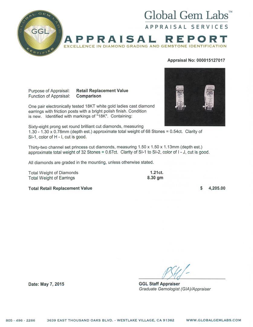 One pair electronically tested 18KT white gold ladies cast diamond earrings with friction posts with a bright polish finish. Identified with markings of "18K". Condition is new. Containing: Two bezel set round brilliant cut diamonds, measuring 5.50 - 5.50 x 3.30mm (depth est.) approximate total weight of 2 Stones = 1.22ct. Clarity: SI-2 to I-1. Color: I - J, Cut is Good. Ninety-Six prong set round brilliant cut diamonds, measuring 1.30 - 1.00 x 0.69mm (depth est.) approximate total weight of 96 Stones = 0.53ct. Clarity: SI-1 to SI-2. Color: I - J, Cut is Good. All diamonds are graded in the mounting, unless otherwise stated. Total Weight of Diamonds 1.75ct. Total Weight of Earrings 4.00 grams. GGL Appraised at $6,470.00.