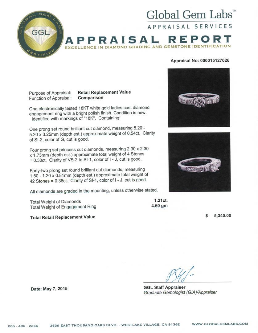 One electronically tested 18KT white gold ladies cast diamond engagement ring with a bright polish finish. Identified with markings of "18K". Condition is new. Containing: One prong set round brilliant cut diamond, measuring 5.20 - 5.20 x 3.25mm (depth est.) approximate weight of 0.54ct. Clarity: SI-2. Color: G, Cut is Good. Four prong set princess cut diamonds, measuring 2.30 x 2.30 x 1.73mm (depth est.) approximate total weight of 4 Stones = 0.30ct. Clarity: VS-2 to SI-1. Color: I - J, Cut is Good. Forty-Two prong set round brilliant cut diamonds, measuring 1.50 - 1.20 x 0.81mm (depth est.) approximate total weight of 42 Stones = 0.38ct. Clarity: SI-1. Color: I - J, Cut is Good. All diamonds are graded in the mounting, unless otherwise stated. Total Weight of Diamonds 1.21ct. Total Weight of Engagement Ring 4.60 grams. GGL Appraised at $5,340.00.