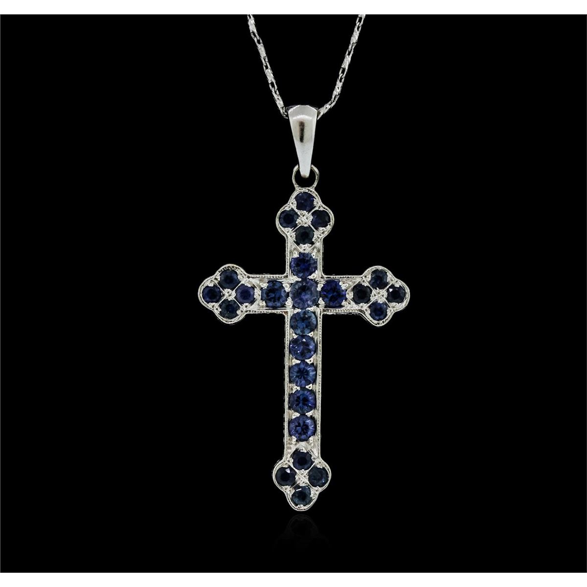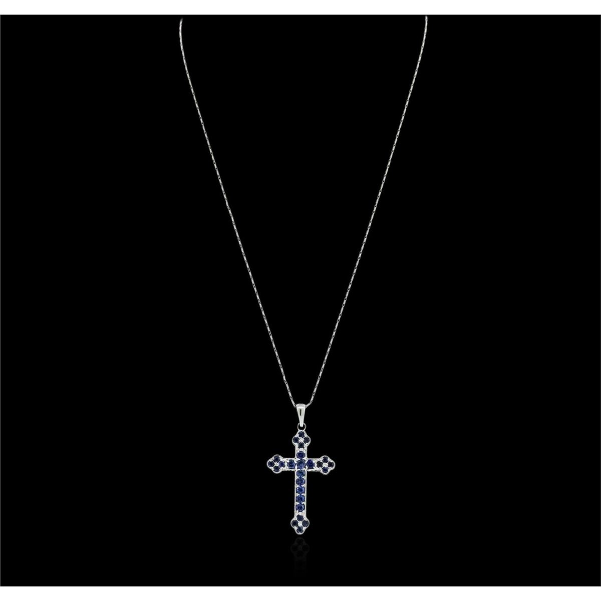One pendant with chain featuring: 18KT white gold weighing 7.80 grams containing blue sapphires with a total weight of 1.25ct.