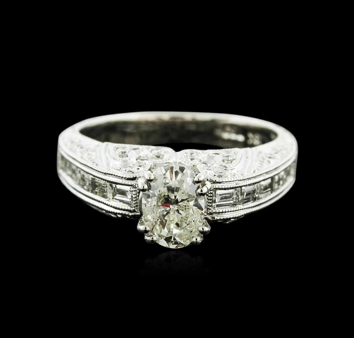One electronically tested 18KT white gold ladies cast diamond engagement ring with a flat shank with a bright polish finish. Identified with markings of "18K 750". Condition is new. Containing: One prong set oval shaped cut diamond, measuring 7.09 x 5.00 x 3.15mm (depth est.) approximate weight of 0.71ct. Clarity: I-2. Color: J, Cut is Good. Ten channel set baguette cut diamonds, measuring 2.00 x 1.50 x 1.28mm (depth est.) approximate total weight of 10 Stones = 0.35ct. Clarity: SI-1. Color: H - I, Cut is Good. Forty prong set round brilliant cut diamonds, measuring 1.50 - 1.10 x 0.78mm (depth est.) approximate total weight of 40 Stones = 0.20ct. Clarity: SI-1 to SI-2. Color: H - I, Cut is Good. All diamonds are graded in the mounting, unless otherwise stated. Total Weight of Diamonds 1.27ct. Total Weight of Engagement Ring 6.70 grams. GGL Appraised at $6,150.00.