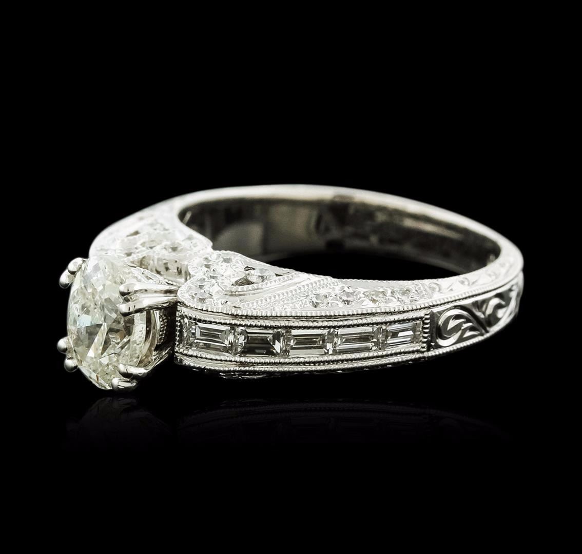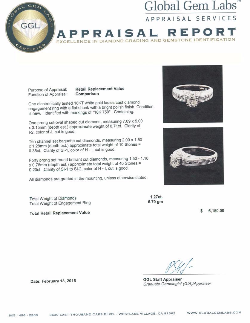 One electronically tested 18KT white gold ladies cast diamond engagement ring with a flat shank with a bright polish finish. Identified with markings of "18K 750". Condition is new. Containing: One prong set oval shaped cut diamond, measuring 7.09 x 5.00 x 3.15mm (depth est.) approximate weight of 0.71ct. Clarity: I-2. Color: J, Cut is Good. Ten channel set baguette cut diamonds, measuring 2.00 x 1.50 x 1.28mm (depth est.) approximate total weight of 10 Stones = 0.35ct. Clarity: SI-1. Color: H - I, Cut is Good. Forty prong set round brilliant cut diamonds, measuring 1.50 - 1.10 x 0.78mm (depth est.) approximate total weight of 40 Stones = 0.20ct. Clarity: SI-1 to SI-2. Color: H - I, Cut is Good. All diamonds are graded in the mounting, unless otherwise stated. Total Weight of Diamonds 1.27ct. Total Weight of Engagement Ring 6.70 grams. GGL Appraised at $6,150.00.
