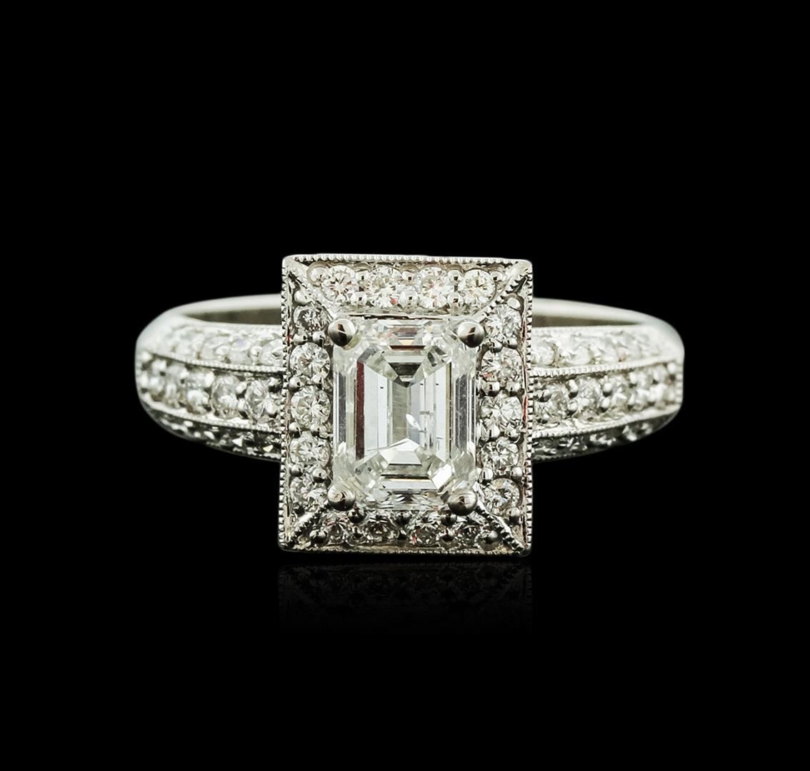 One electronically tested 18KT white gold ladies cast diamond engagement ring with a half round shank with a bright polish finish. Identified with markings of "K18". Condition is new. Containing: One prong set emerald cut diamond, measuring 6.73 x 4.83 x 3.24mm (depth est.) approximate weight of 0.97ct. Clarity: I-1. Color: J, Cut is Good. Forty-Eight prong set round brilliant cut diamonds, measuring 1.30 - 1.10 x 0.72mm (depth est.) approximate total weight of 48 Stones = 0.30ct. Clarity: SI-1. Color: I - J, Cut is Good. All diamonds are graded in the mounting, unless otherwise stated. Total Weight of Diamonds 1.27ct. Total Weight of Engagement Ring 5.10 grams. GGL Appraised at $7,155.00.
