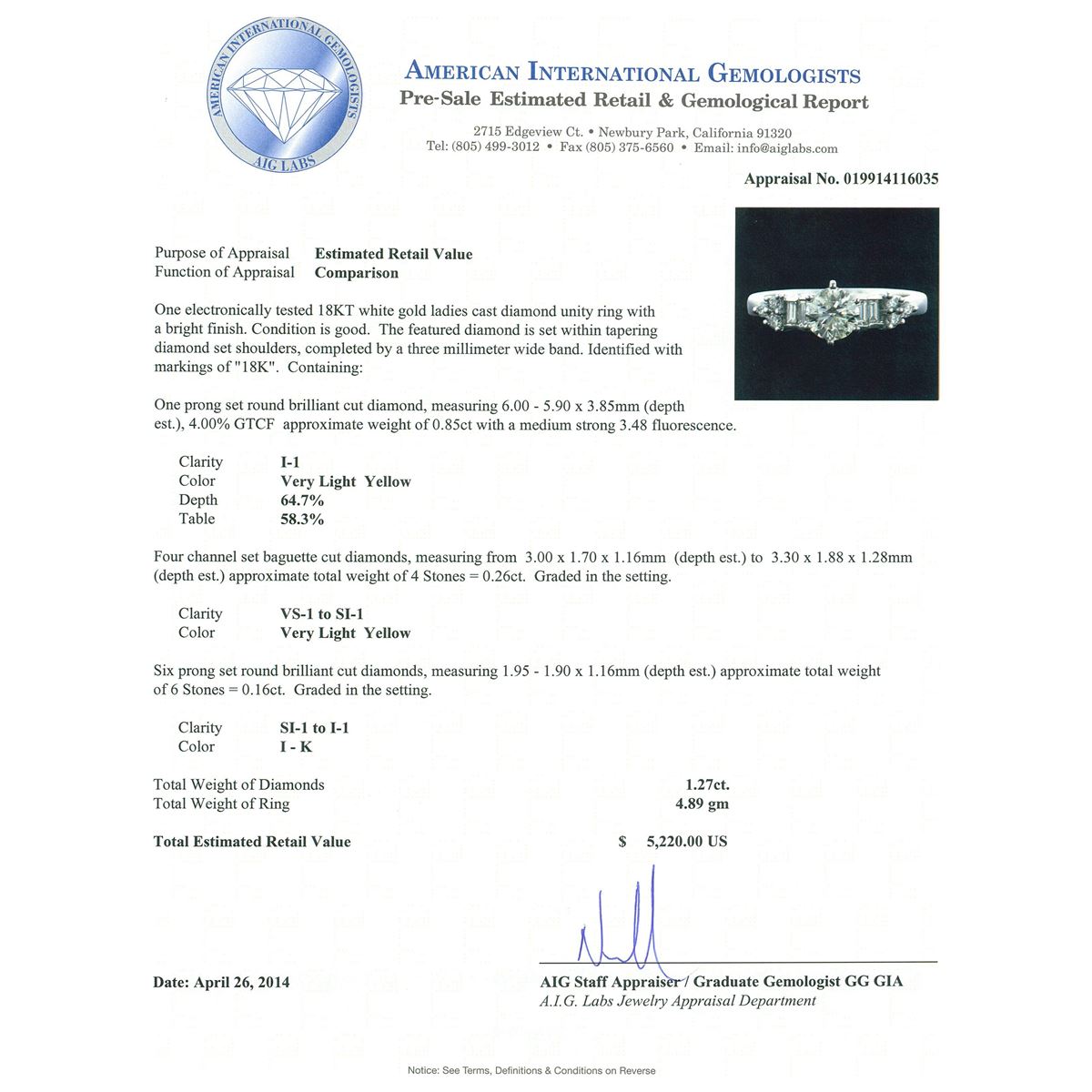 One electronically tested 18KT white gold ladies cast diamond unity ring with a bright finish. Condition is good. The featured diamond is set within tapering diamond set shoulders, completed by a three millimeter wide band. Identified with markings of "18K". Containing: One prong set round brilliant cut diamond, measuring 6.00 - 5.90 x 3.85mm (depth est.), 4.00%. GTCF approximate weight of 0.85ct with a medium strong 3.48 fluorescence. Clarity: I-1 . Depth: 64.7%. Table 58.3%. Four channel set baguette cut diamonds, measuring from 3.00 x 1.70 x 1.16mm (depth est.) to 3.30 x 1.88 x 1.28mm (depth est.) approximate. Total Weight of 4 Stones = 0.26ct. Graded in the setting. Clarity: VS-1 to SI-1 Six prong set round brilliant cut diamonds, measuring 1.95 - 1.90 x 1.16mm (depth est.) approximate. Total Weight of 6 Stones = 0.16ct. Graded in the setting. Clarity: SI-1 to I-1 . Color: I - K. Total Weight of Diamonds 1.27ct.. Total Weight of Ring 4.89 grams. AIG Appraised at $5,220.00.