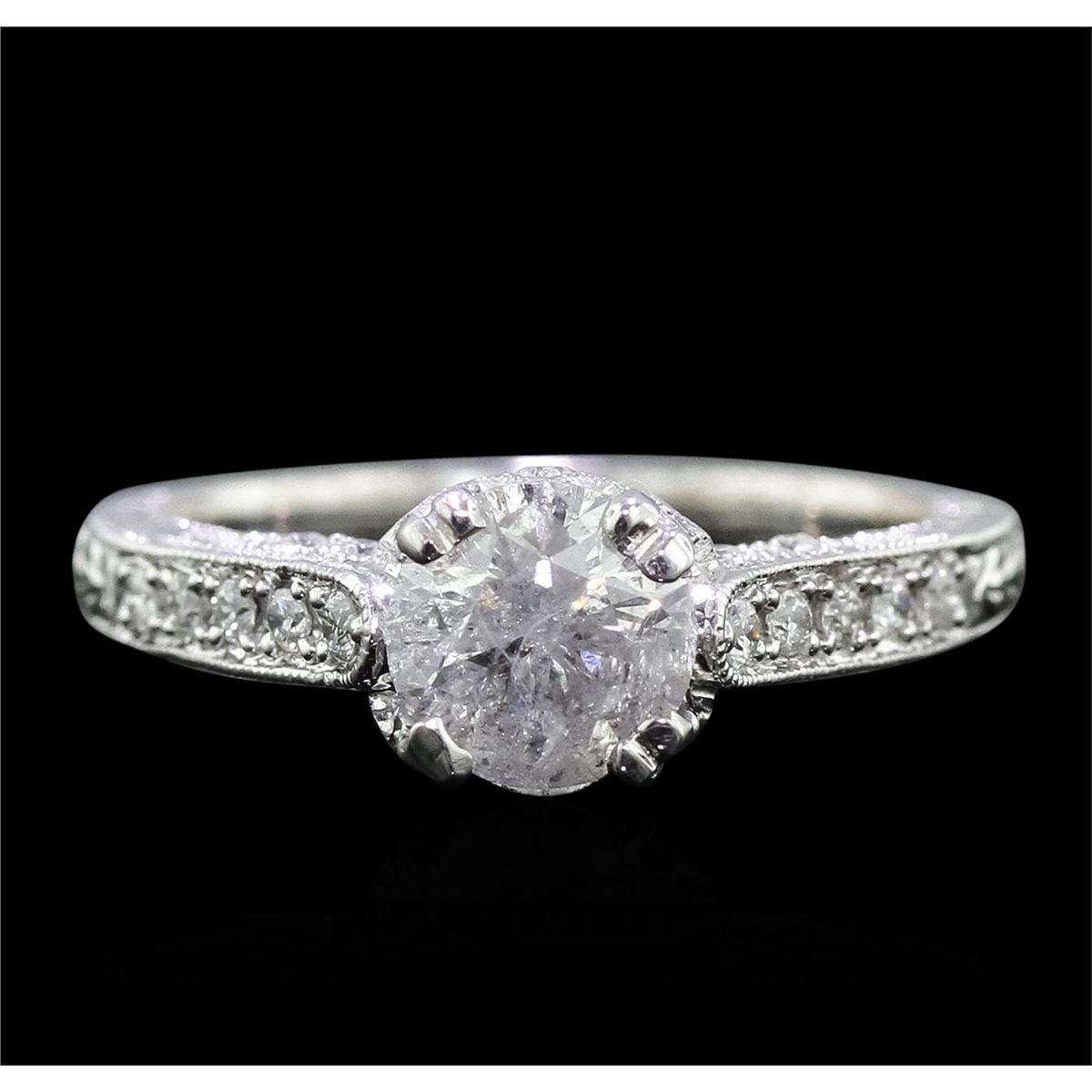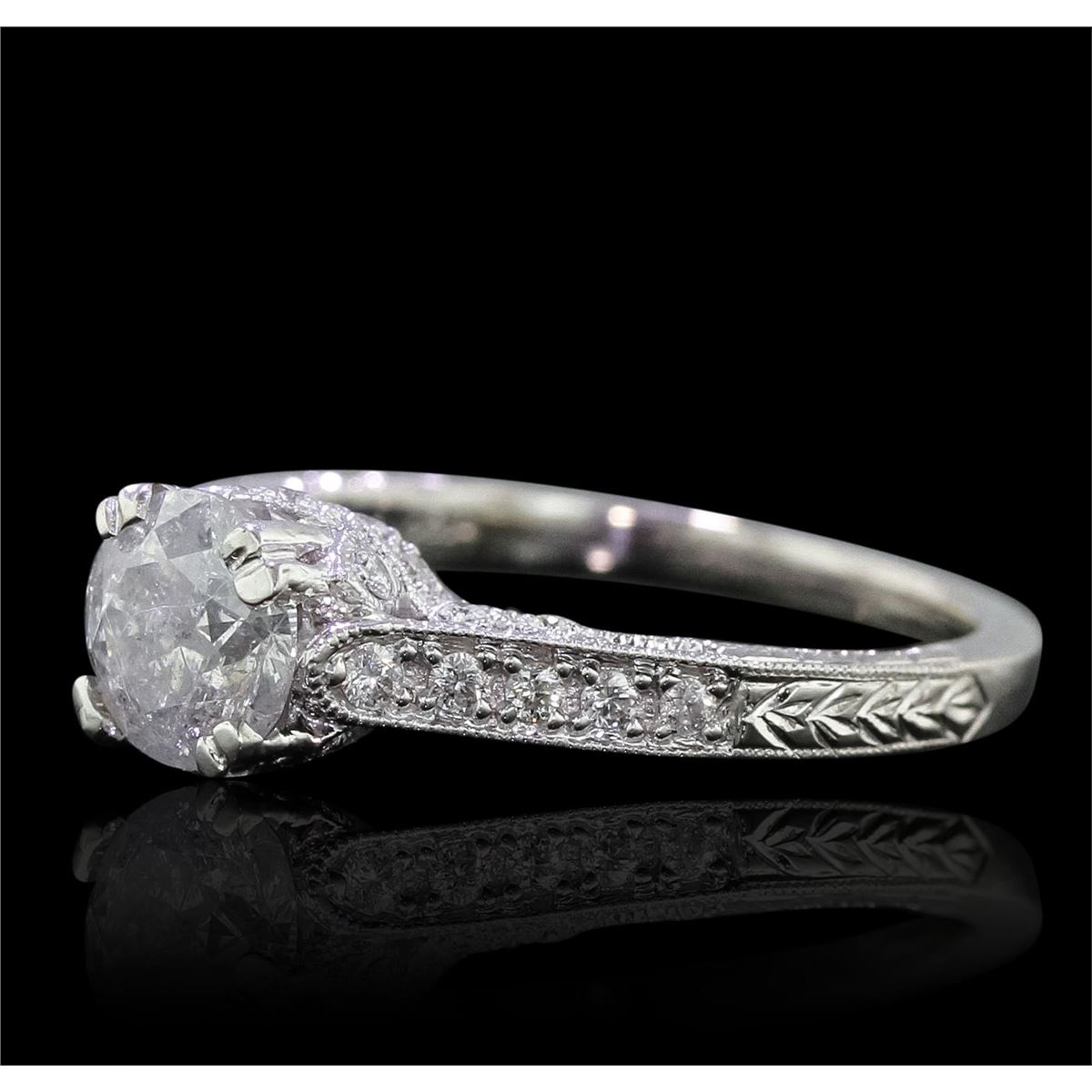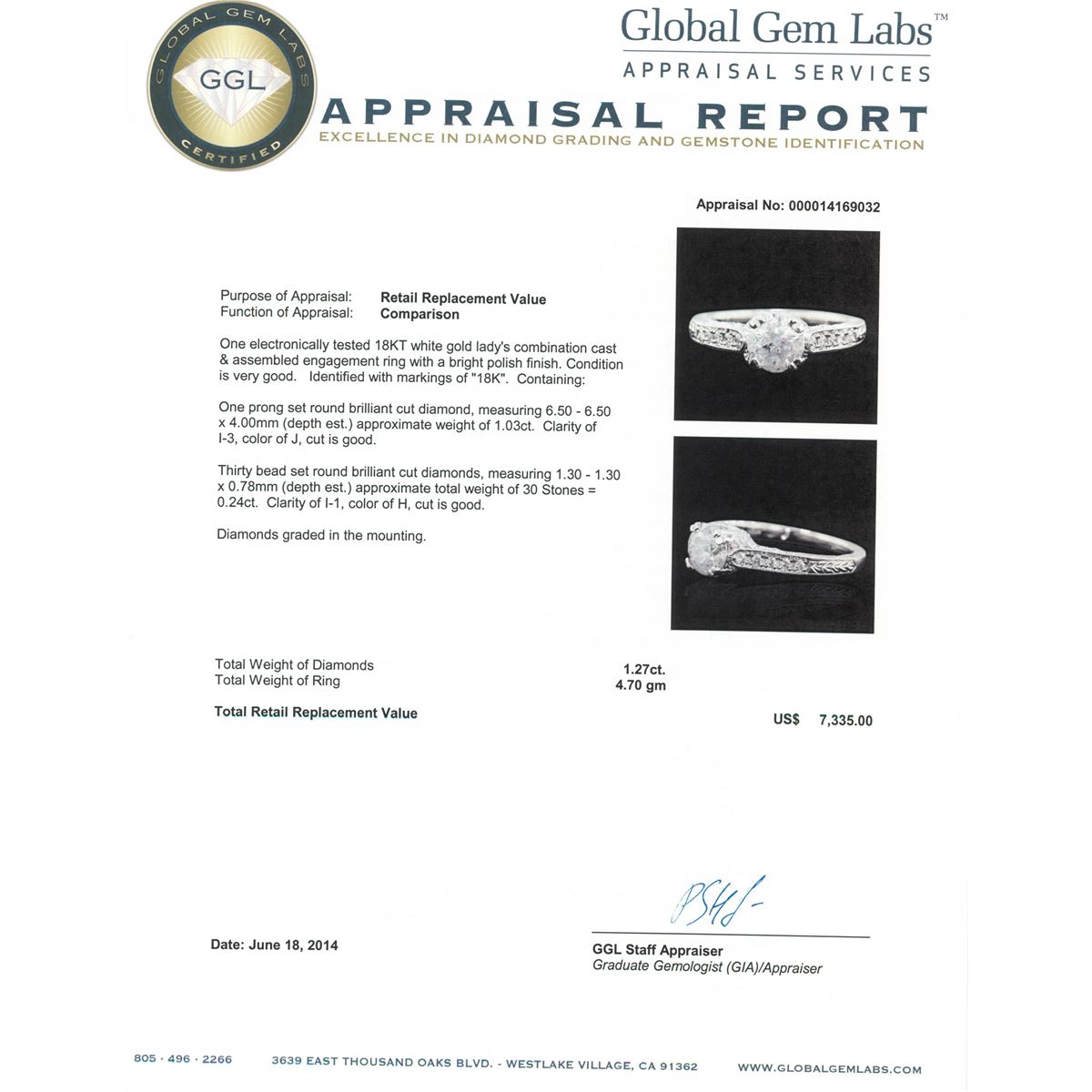 One electronically tested 18KT white gold Ladies combination cast & assembled engagement ring with a bright polish finish. Condition is very good. Identified with markings of "18K". Containing: One prong set round brilliant cut diamond, measuring 6.50 - 6.50 x 4.00mm (depth est.) approximate weight of 1.03ct. Clarity: I-3. Color: J, Cut is Good. Thirty bead set round brilliant cut diamonds, measuring 1.30 - 1.30 x 0.78mm (depth est.) approximate. Total Weight of 30 Stones = 0.24ct. Clarity: I-1. Color: H, Cut is Good. Diamonds graded in the mounting. Total Weight of Diamonds 1.27ct. Total Weight of Ring 4.70 grams. GGL Appraised at $7,335.00.