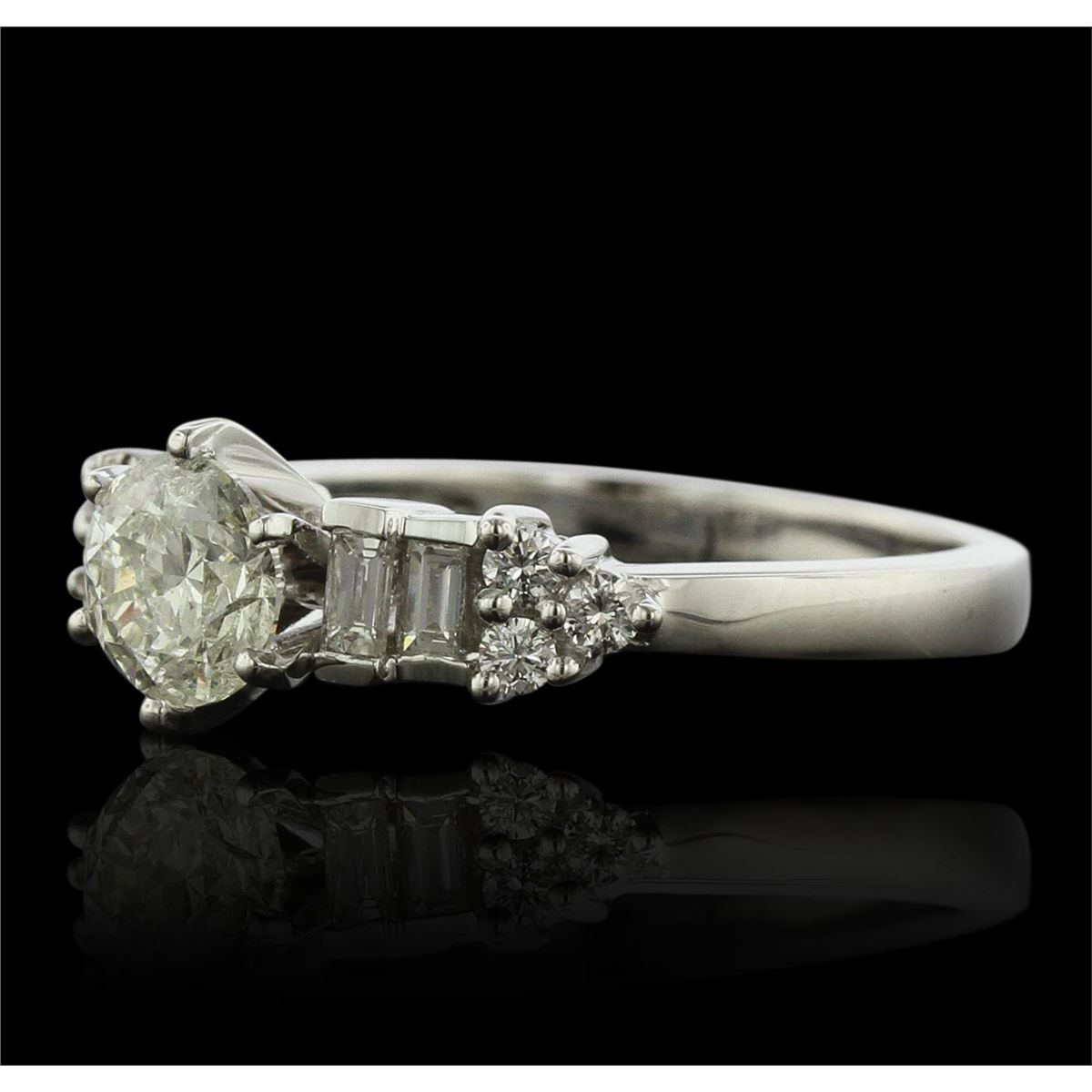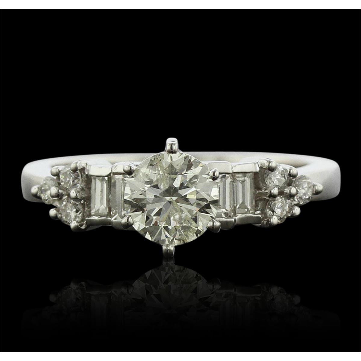One electronically tested 18KT white gold ladies cast diamond unity ring with a bright finish. Condition is good. The featured diamond is set within tapering diamond set shoulders, completed by a three millimeter wide band. Identified with markings of "18K". Containing: One prong set round brilliant cut diamond, measuring 6.00 - 5.90 x 3.85mm (depth est.), 4.00%. GTCF approximate weight of 0.85ct with a medium strong 3.48 fluorescence. Clarity: I-1 . Depth: 64.7%. Table 58.3%. Four channel set baguette cut diamonds, measuring from 3.00 x 1.70 x 1.16mm (depth est.) to 3.30 x 1.88 x 1.28mm (depth est.) approximate. Total Weight of 4 Stones = 0.26ct. Graded in the setting. Clarity: VS-1 to SI-1 Six prong set round brilliant cut diamonds, measuring 1.95 - 1.90 x 1.16mm (depth est.) approximate. Total Weight of 6 Stones = 0.16ct. Graded in the setting. Clarity: SI-1 to I-1 . Color: I - K. Total Weight of Diamonds 1.27ct.. Total Weight of Ring 4.89 grams. AIG Appraised at $5,220.00.