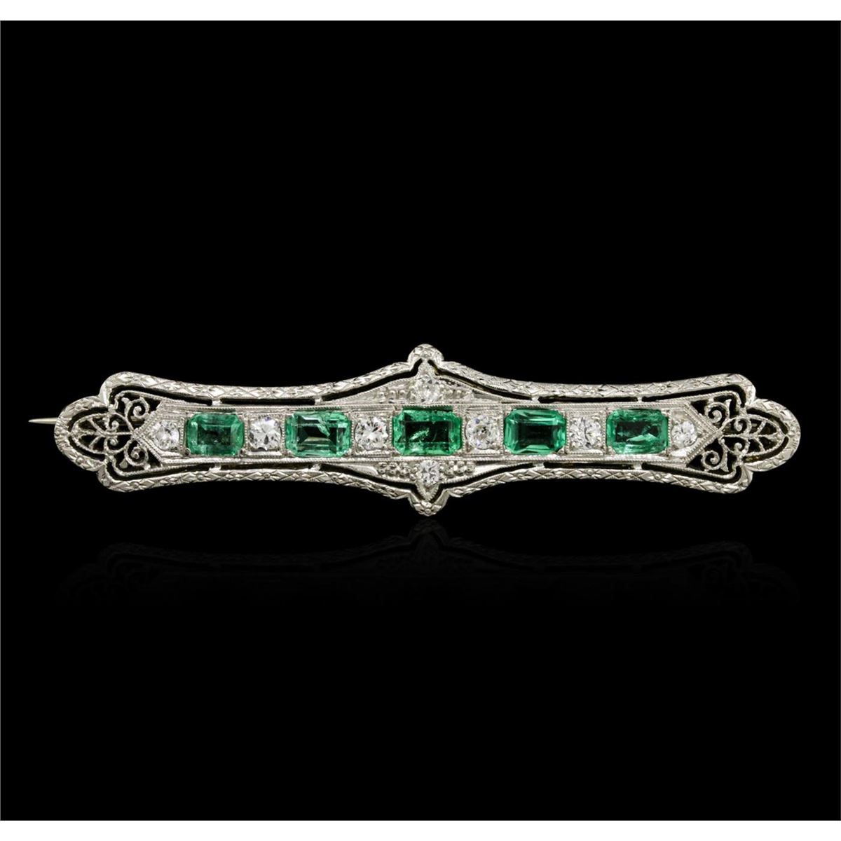 One electronically tested 18KT white gold ladies combination cast & assembled emerald and diamond pin with a bright polish finish. Condition is very good. Containing: Five prong set emerald standard step cut natural emeralds, measuring 4.50 x 3.50 x 2.28mm, approximate total weight of 1.30ct., clarity is slightly included, type III, light, very slightly grayish, green color, (GIA G 3/3), cut is good. Eight prong set Old European cut diamonds, measuring 2.50 - 2.50 x 1.55mm (depth est.) approximate total weight of 8 Stones = 0.47ct. Clarity: SI-1 to SI-2. Color: G - H. Colored gemstones are presumed to have been subjected to commonly used enhancement processes. All diamonds and colored gemstones are graded in the mounting, unless otherwise stated. Total Weight of Colored Stones 1.30ct. Total Weight of Diamonds 0.47ct. Total Weight of Pin 7.00 grams. GGL Appraised at $4,005.00.
