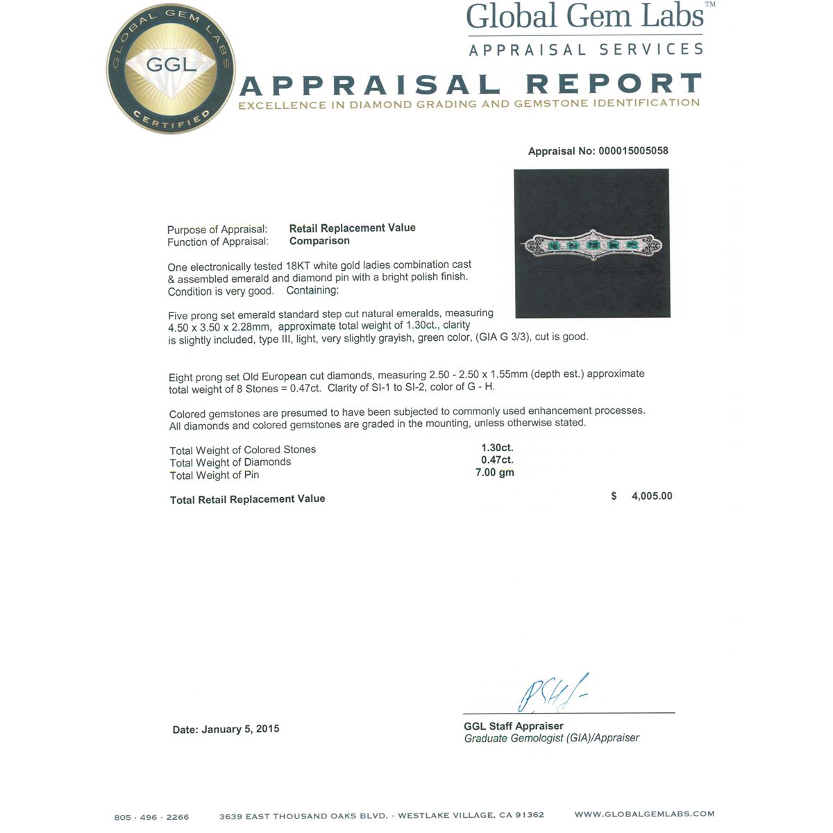 One electronically tested 18KT white gold ladies combination cast & assembled emerald and diamond pin with a bright polish finish. Condition is very good. Containing: Five prong set emerald standard step cut natural emeralds, measuring 4.50 x 3.50 x 2.28mm, approximate total weight of 1.30ct., clarity is slightly included, type III, light, very slightly grayish, green color, (GIA G 3/3), cut is good. Eight prong set Old European cut diamonds, measuring 2.50 - 2.50 x 1.55mm (depth est.) approximate total weight of 8 Stones = 0.47ct. Clarity: SI-1 to SI-2. Color: G - H. Colored gemstones are presumed to have been subjected to commonly used enhancement processes. All diamonds and colored gemstones are graded in the mounting, unless otherwise stated. Total Weight of Colored Stones 1.30ct. Total Weight of Diamonds 0.47ct. Total Weight of Pin 7.00 grams. GGL Appraised at $4,005.00.