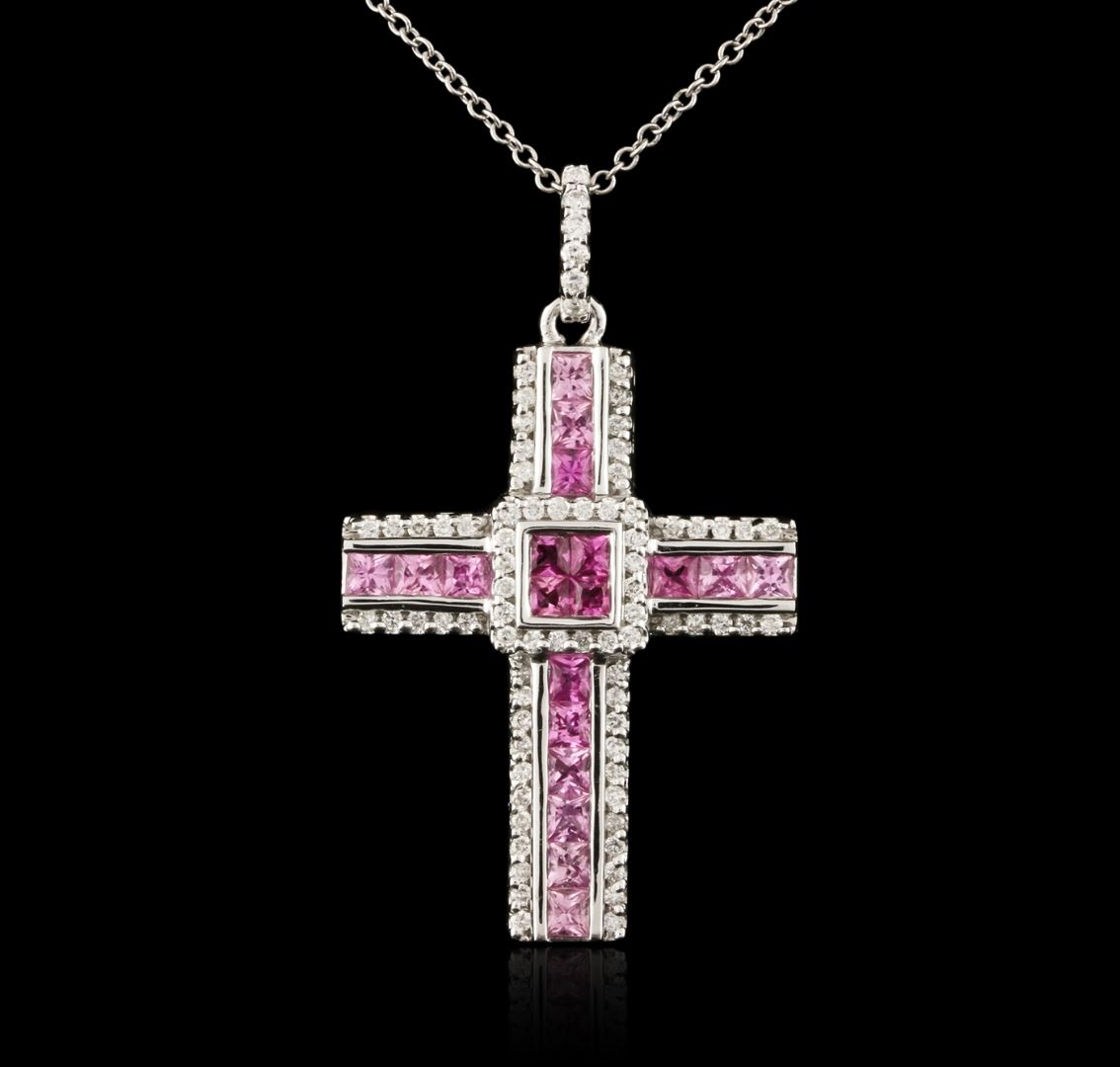 One cross pendant with chain featuring: 14KT white gold weighing 7.80 grams containing pink sapphires with a total weight of 1.30ct and prong set round diamonds with a total weight of 0.31ct.