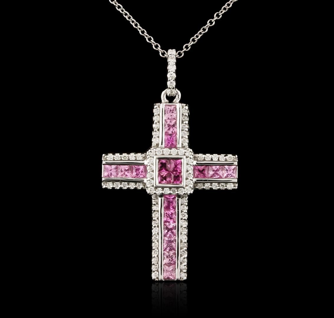 One cross pendant with chain featuring: 14KT white gold weighing 7.80 grams containing pink sapphires with a total weight of 1.30ct and prong set round diamonds with a total weight of 0.31ct.