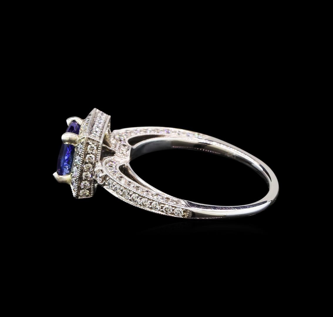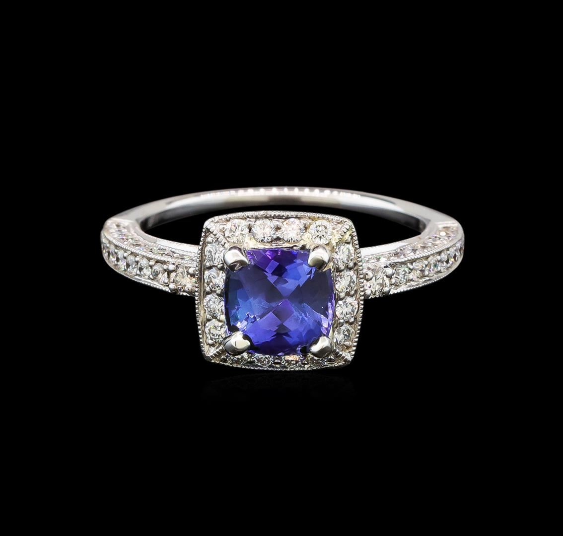 One electronically tested 18KT white gold ladies cast tanzanite and diamond ring with a bright polish finish. Identified with markings of "18K". Condition is new. Containing: One prong set oval square cushion modified brilliant cut natural tanzanite, measuring 6.40 x 6.40 x 4.16mm, approximate weight of 1.34ct., clarity is eye clean, type I, medium light, very slightly grayish, bluish violet color, (GIA bV 4/3), cut is good. One Hundred Two prong set round brilliant cut diamonds, measuring 1.20 - 1.20 x 0.72mm (depth est.) approximate total weight of 102 Stones = 0.64ct. Clarity: SI-1 to SI-2. Color: I - J, Cut is Good. Colored gemstones are presumed to have been subjected to commonly used enhancement processes. All diamonds and colored gemstones are graded in the mounting, unless otherwise stated. Total Weight of Colored Stones 1.34ct. Total Weight of Diamonds 0.64ct. Total Weight of Ring 3.90 grams. GGL Appraised at $3,440.00.