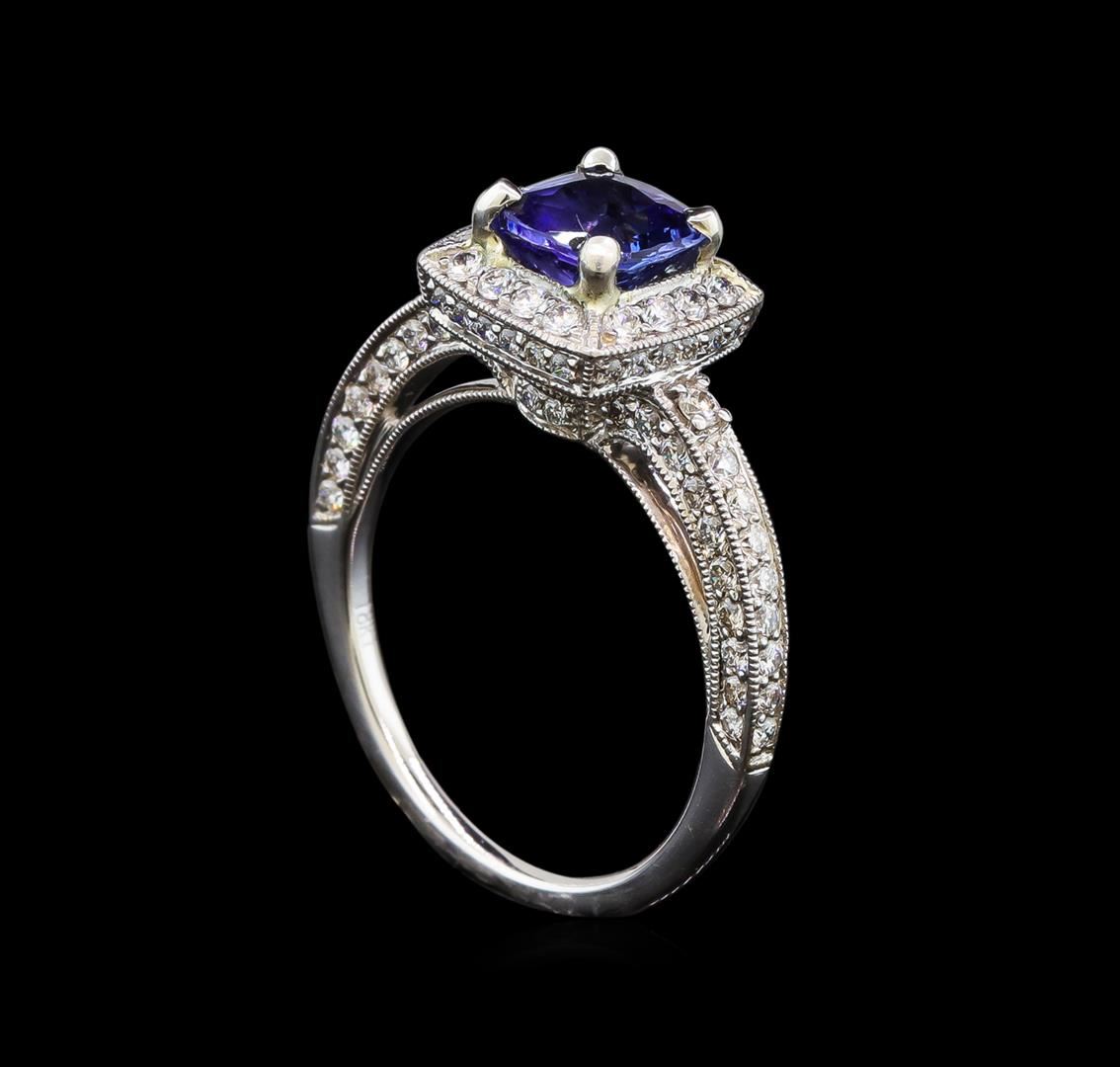 One electronically tested 18KT white gold ladies cast tanzanite and diamond ring with a bright polish finish. Identified with markings of "18K". Condition is new. Containing: One prong set oval square cushion modified brilliant cut natural tanzanite, measuring 6.40 x 6.40 x 4.16mm, approximate weight of 1.34ct., clarity is eye clean, type I, medium light, very slightly grayish, bluish violet color, (GIA bV 4/3), cut is good. One Hundred Two prong set round brilliant cut diamonds, measuring 1.20 - 1.20 x 0.72mm (depth est.) approximate total weight of 102 Stones = 0.64ct. Clarity: SI-1 to SI-2. Color: I - J, Cut is Good. Colored gemstones are presumed to have been subjected to commonly used enhancement processes. All diamonds and colored gemstones are graded in the mounting, unless otherwise stated. Total Weight of Colored Stones 1.34ct. Total Weight of Diamonds 0.64ct. Total Weight of Ring 3.90 grams. GGL Appraised at $3,440.00.