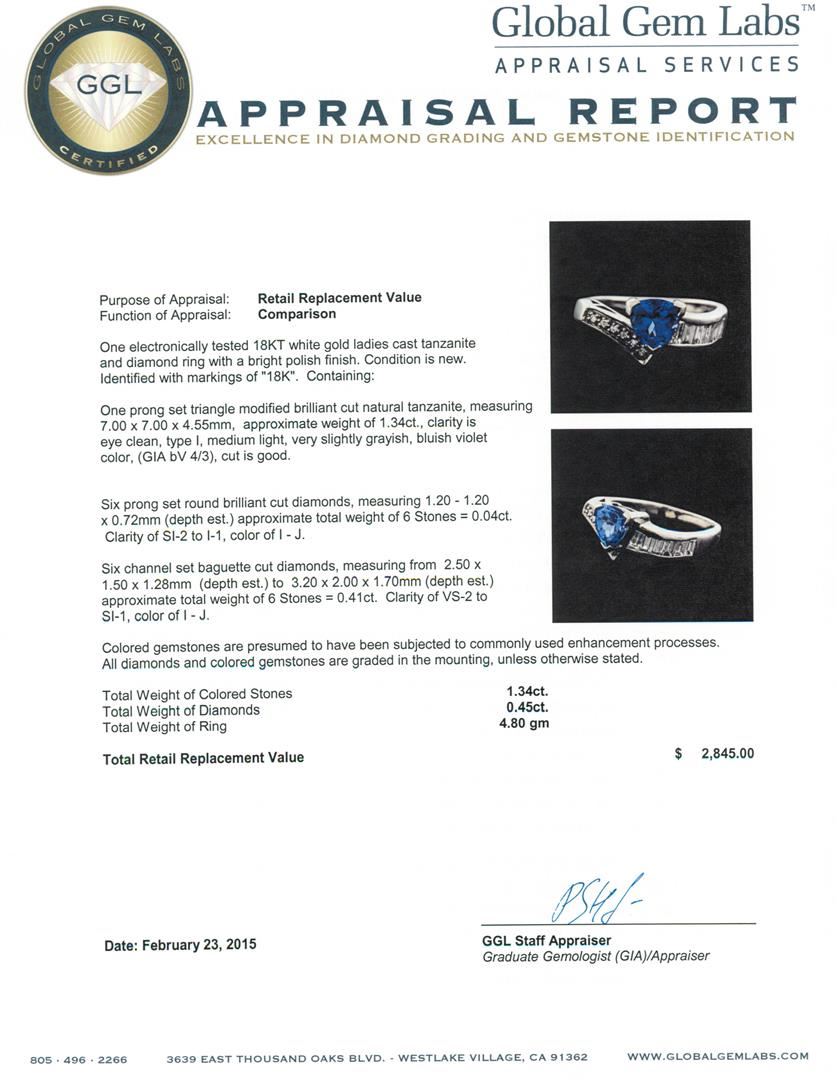 One electronically tested 18KT white gold ladies cast tanzanite and diamond ring with a bright polish finish. Identified with markings of "18K". Condition is new. Containing: One prong set triangle modified brilliant cut natural tanzanite, measuring 7.00 x 7.00 x 4.55mm, approximate weight of 1.34ct., clarity is eye clean, type I, medium light, very slightly grayish, bluish violet color, (GIA bV 4/3), cut is good. Six prong set round brilliant cut diamonds, measuring 1.20 - 1.20 x 0.72mm (depth est.) approximate total weight of 6 Stones = 0.04ct. Clarity: SI-2 to I-1. Color: I - J. Six channel set baguette cut diamonds, measuring from 2.50 x 1.50 x 1.28mm (depth est.) to 3.20 x 2.00 x 1.70mm (depth est.) approximate total weight of 6 Stones = 0.41ct. Clarity: VS-2 to SI-1. Color: I - J. Colored gemstones are presumed to have been subjected to commonly used enhancement processes. All diamonds and colored gemstones are graded in the mounting, unless otherwise stated. Total Weight of Colored Stones 1.34ct. Total Weight of Diamonds 0.45ct. Total Weight of Ring 4.80 grams. GGL Appraised.
