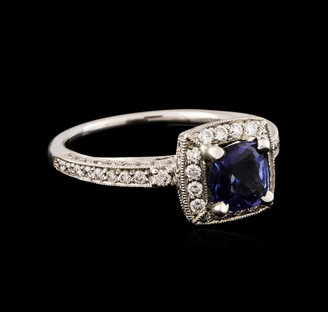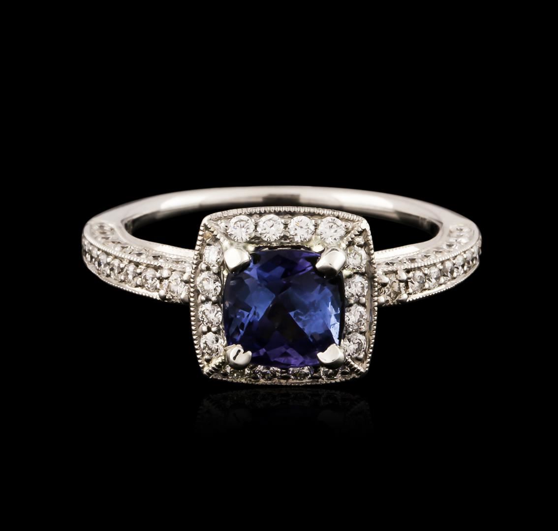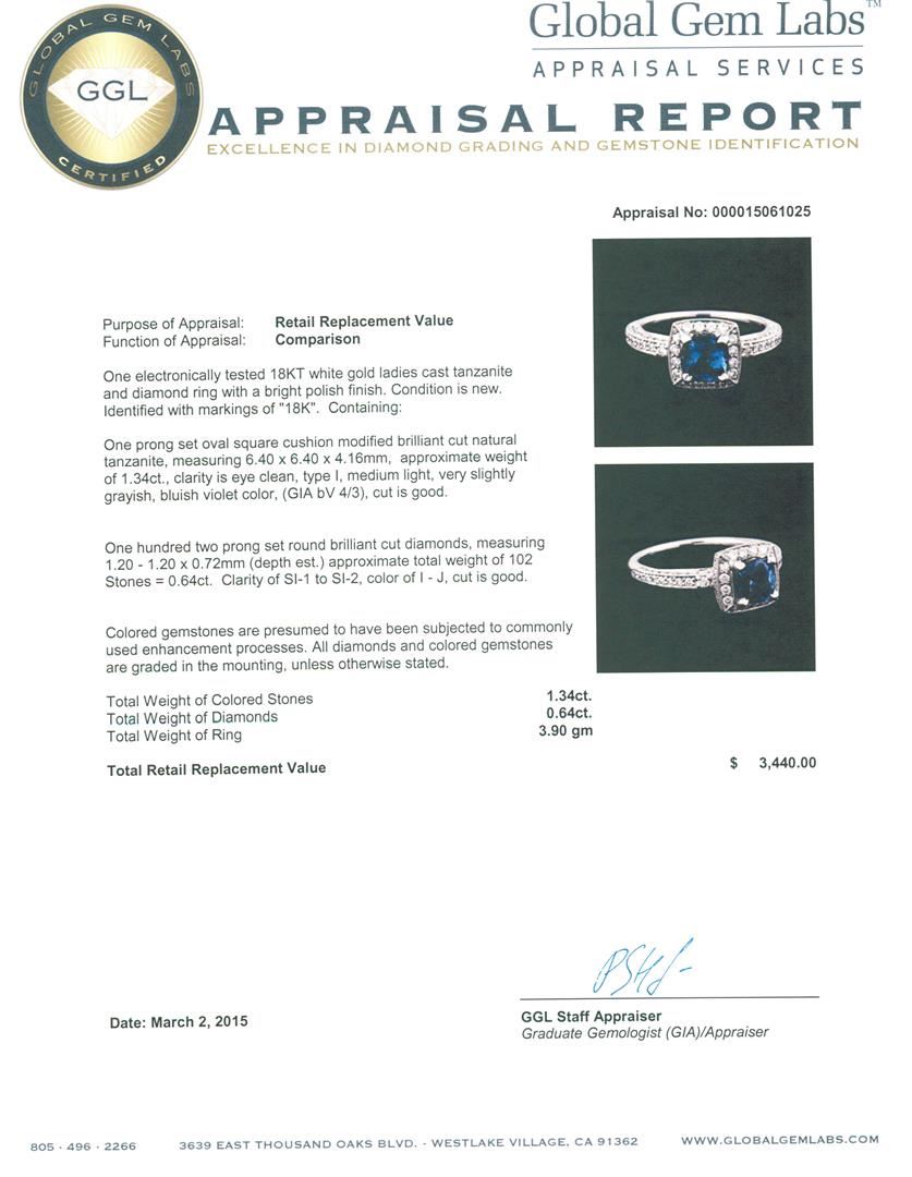 One electronically tested 18KT white gold ladies cast tanzanite and diamond ring with a bright polish finish. Identified with markings of "18K". Condition is new. Containing: One prong set oval square cushion modified brilliant cut natural tanzanite, measuring 6.40 x 6.40 x 4.16mm, approximate weight of 1.34ct., clarity is eye clean, type I, medium light, very slightly grayish, bluish violet color, (GIA bV 4/3), cut is good. One Hundred Two prong set round brilliant cut diamonds, measuring 1.20 - 1.20 x 0.72mm (depth est.) approximate total weight of 102 Stones = 0.64ct. Clarity: SI-1 to SI-2. Color: I - J, Cut is Good. Colored gemstones are presumed to have been subjected to commonly used enhancement processes. All diamonds and colored gemstones are graded in the mounting, unless otherwise stated. Total Weight of Colored Stones 1.34ct. Total Weight of Diamonds 0.64ct. Total Weight of Ring 3.90 grams. GGL Appraised at $3,440.00.