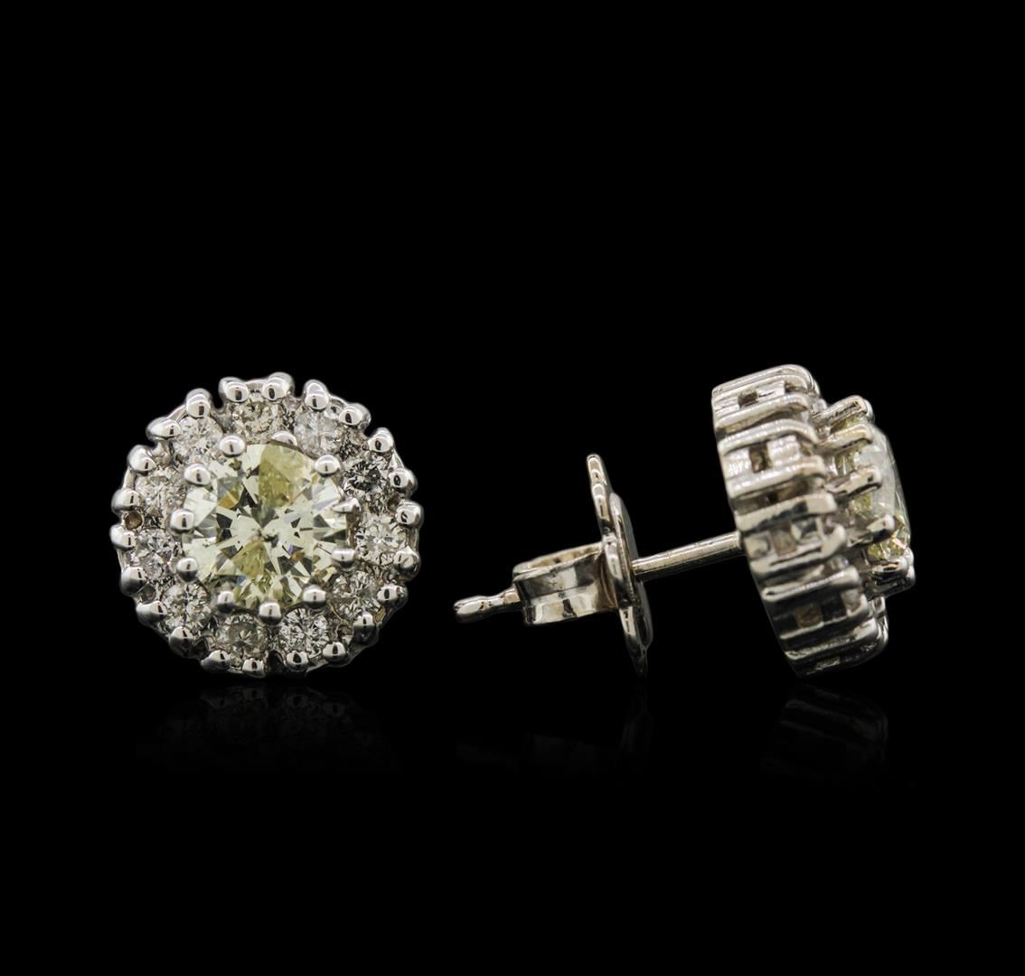 One pair electronically tested 18KT white gold ladies cast diamond stud earrings with friction posts with a bright polish finish. Identified with markings of "18K". Condition is new. Containing: Two prong set round brilliant cut diamonds, measuring 5.30 - 5.30 x 3.18mm (depth est.) approximate total weight of 2 Stones = 1.09ct. Clarity of I-1, Color of L, Cut is Good. Twenty-Two prong set round brilliant cut diamonds, measuring 1.50 - 1.50 x 0.90mm (depth est.) approximate total weight of 22 Stones = 0.27ct. Clarity of SI-2 to I-1, Color of I - J, Cut is Good. All diamonds are graded in the mounting, unless otherwise stated. Total Weight of Diamonds 1.36ct. Total Weight of Stud Earrings 4.90 grams. GGL Appraised at $4,400.00.