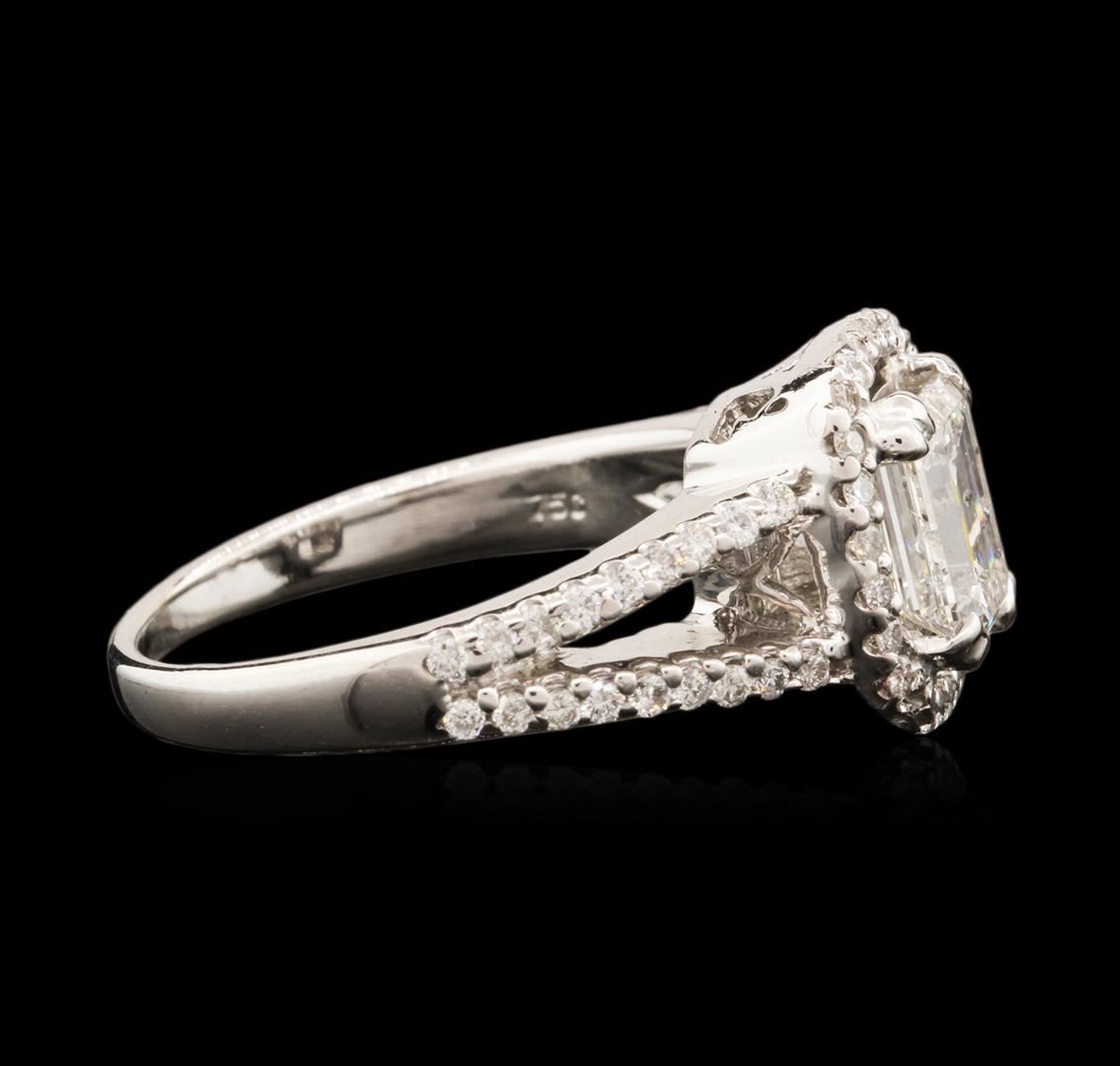One electronically tested 18KT white gold ladies combination cast & assembled diamond engagement ring with a tapered shank with a bright polish finish. Identified with markings of "750". Condition is new. Containing: One prong set emerald cut diamond, measuring 6.70 x 4.88 x 3.31mm (depth est.) approximate weight of 1.00ct. Clarity: I-1. Color: I, Cut is Good. Fifty-Nine prong set round brilliant cut diamonds, measuring 1.20 - 1.20 x 0.72mm (depth est.) approximate total weight of 59 Stones = 0.37ct. Clarity: I-1 to I-2. Color: H - I, Cut is Good. All diamonds are graded in the mounting, unless otherwise stated. Total Weight of Diamonds 1.37ct. Total Weight of Engagement Ring 5.90 grams. GGL Appraised at $8,095.00.