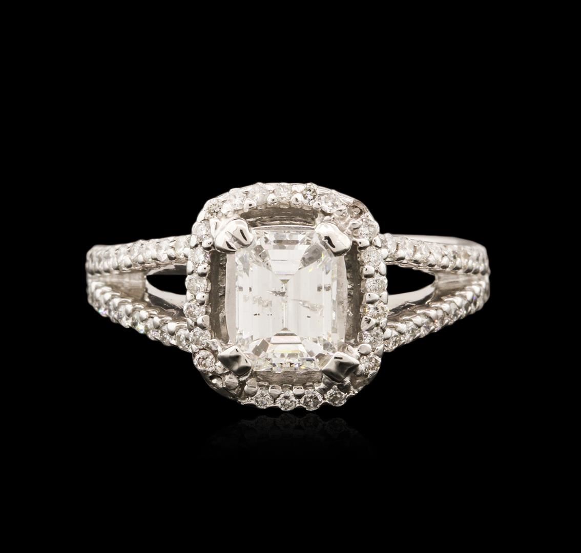 One electronically tested 18KT white gold ladies combination cast & assembled diamond engagement ring with a tapered shank with a bright polish finish. Identified with markings of "750". Condition is new. Containing: One prong set emerald cut diamond, measuring 6.70 x 4.88 x 3.31mm (depth est.) approximate weight of 1.00ct. Clarity: I-1. Color: I, Cut is Good. Fifty-Nine prong set round brilliant cut diamonds, measuring 1.20 - 1.20 x 0.72mm (depth est.) approximate total weight of 59 Stones = 0.37ct. Clarity: I-1 to I-2. Color: H - I, Cut is Good. All diamonds are graded in the mounting, unless otherwise stated. Total Weight of Diamonds 1.37ct. Total Weight of Engagement Ring 5.90 grams. GGL Appraised at $8,095.00.