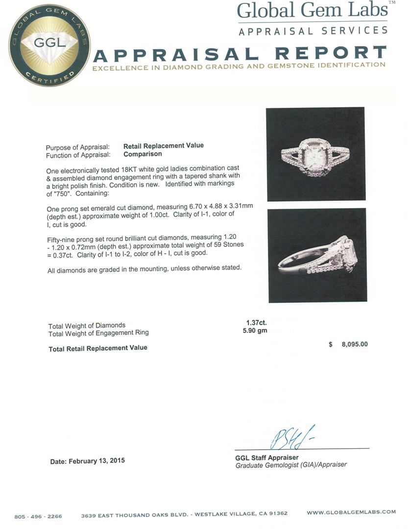 One electronically tested 18KT white gold ladies combination cast & assembled diamond engagement ring with a tapered shank with a bright polish finish. Identified with markings of "750". Condition is new. Containing: One prong set emerald cut diamond, measuring 6.70 x 4.88 x 3.31mm (depth est.) approximate weight of 1.00ct. Clarity: I-1. Color: I, Cut is Good. Fifty-Nine prong set round brilliant cut diamonds, measuring 1.20 - 1.20 x 0.72mm (depth est.) approximate total weight of 59 Stones = 0.37ct. Clarity: I-1 to I-2. Color: H - I, Cut is Good. All diamonds are graded in the mounting, unless otherwise stated. Total Weight of Diamonds 1.37ct. Total Weight of Engagement Ring 5.90 grams. GGL Appraised at $8,095.00.