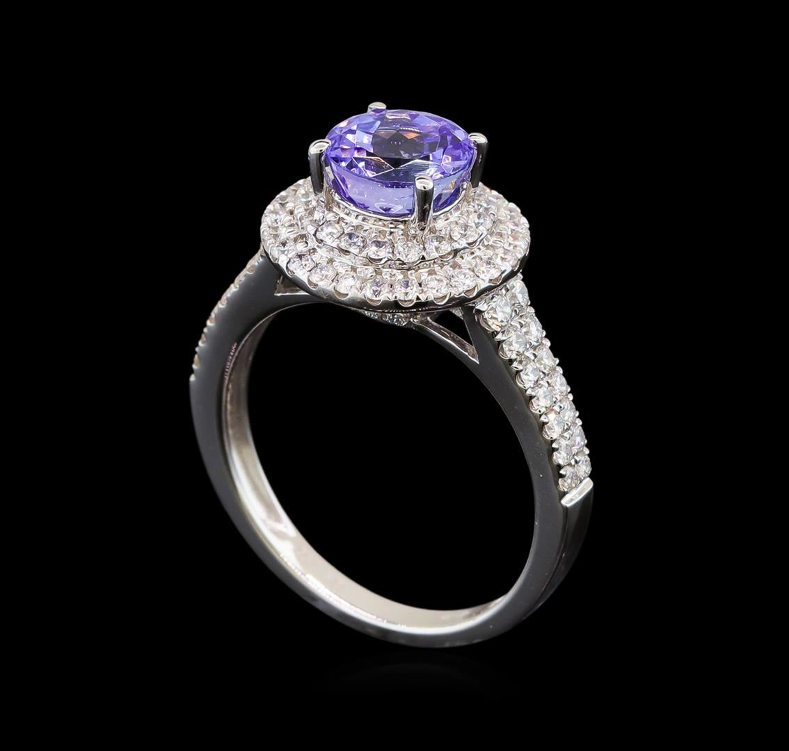 One electronically tested 18KT white gold ladies cast tanzanite and diamond ring with a bright polish finish. Identified with markings of "750". Condition is new. Containing: One prong set round modified brilliant cut natural tanzanite, measuring 6.80 - 6.80 x 4.42 mm, approximate weight of 1.37ct., clarity is eye clean, type I, light, very slightly grayish, violet color, (GIA V 3/3), cut is good. Seventy prong set round brilliant cut diamonds, measuring 1.50 - 1.20 x 0.81mm (depth est.) approximate total weight of 70 Stones = 0.50ct. Clarity: SI-1 to I-1. Color: H - I, Cut is Good. Colored gemstones are presumed to have been subjected to commonly used enhancement processes. All diamonds and colored gemstones are graded in the mounting, unless otherwise stated. Total Weight of Colored Stones 1.37ct. Total Weight of Diamonds 0.50ct. Total Weight of Ring 4.80 grams. GGL Appraised at $3,340.00.