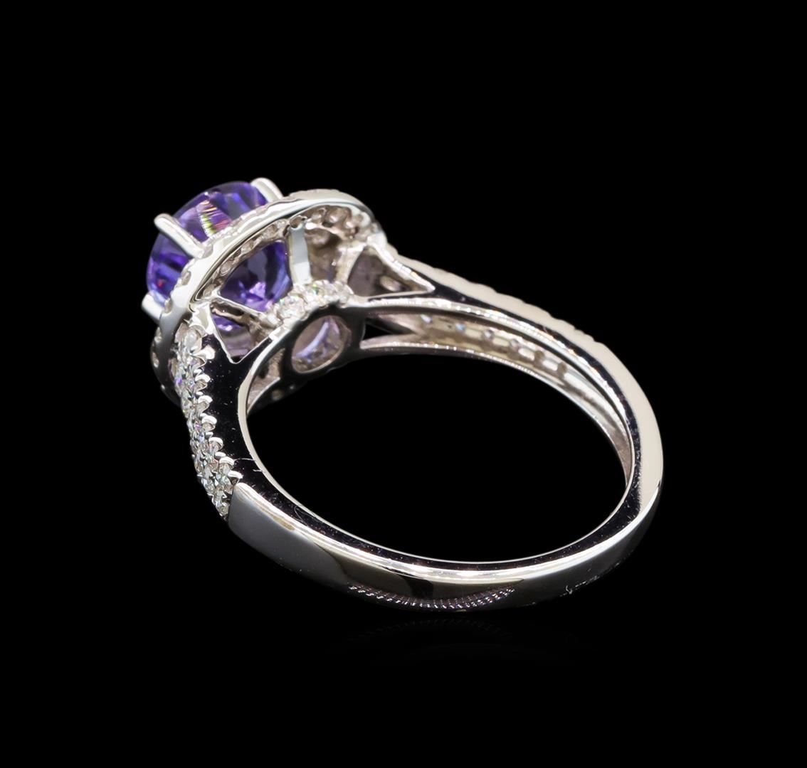 One electronically tested 18KT white gold ladies cast tanzanite and diamond ring with a bright polish finish. Identified with markings of "750". Condition is new. Containing: One prong set round modified brilliant cut natural tanzanite, measuring 6.80 - 6.80 x 4.42 mm, approximate weight of 1.37ct., clarity is eye clean, type I, light, very slightly grayish, violet color, (GIA V 3/3), cut is good. Seventy prong set round brilliant cut diamonds, measuring 1.50 - 1.20 x 0.81mm (depth est.) approximate total weight of 70 Stones = 0.50ct. Clarity: SI-1 to I-1. Color: H - I, Cut is Good. Colored gemstones are presumed to have been subjected to commonly used enhancement processes. All diamonds and colored gemstones are graded in the mounting, unless otherwise stated. Total Weight of Colored Stones 1.37ct. Total Weight of Diamonds 0.50ct. Total Weight of Ring 4.80 grams. GGL Appraised at $3,340.00.