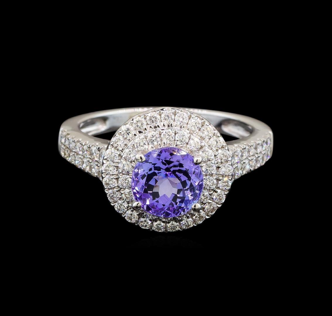 One electronically tested 18KT white gold ladies cast tanzanite and diamond ring with a bright polish finish. Identified with markings of "750". Condition is new. Containing: One prong set round modified brilliant cut natural tanzanite, measuring 6.80 - 6.80 x 4.42 mm, approximate weight of 1.37ct., clarity is eye clean, type I, light, very slightly grayish, violet color, (GIA V 3/3), cut is good. Seventy prong set round brilliant cut diamonds, measuring 1.50 - 1.20 x 0.81mm (depth est.) approximate total weight of 70 Stones = 0.50 ct. Clarity: SI-1 to I-1. Color: H - I, Cut is Good. Colored gemstones are presumed to have been subjected to commonly used enhancement processes. All diamonds and colored gemstones are graded in the mounting, unless otherwise stated. Total Weight of Colored Stones 1.37ct. Total Weight of Diamonds 0.50 ct. Total Weight of Ring 4.80 grams. GGL Appraised.