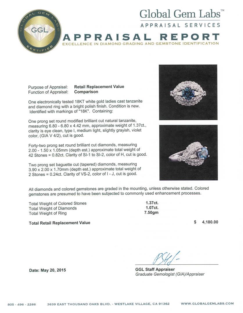 One electronically tested 18KT white gold ladies cast tanzanite and diamond ring with a bright polish finish. Identified with markings of "18K". Condition is new. Containing: One prong set round modified brilliant cut natural tanzanite, measuring 6.80 - 6.80 x 4.42 mm, approximate weight of 1.37ct., clarity is eye clean, type I, medium light, slightly grayish, violet color, (GIA V 4/2), cut is good. Forty-Two prong set round brilliant cut diamonds, measuring 2.00 - 1.50 x 1.05mm (depth est.) approximate total weight of 42 Stones = 0.82ct. Clarity: SI-1 to SI-2. Color: H, Cut is Good. Two prong set baguette cut (tapered) diamonds, measuring 3.90 x 2.00 x 1.70mm (depth est.) approximate total weight of 2 Stones = 0.24ct. Clarity: VS-2. Color: I - J, Cut is Good. All diamonds and colored gemstones are graded in the mounting, unless otherwise stated. Colored gemstones are presumed to have been subjected to commonly used enhancement processes. Total Weight of Colored Stones 1.37ct. Total Weight of Diamonds 1.07ct. Total Weight of Ring 7.50 grams. GGL Appraised.