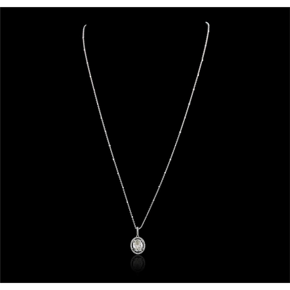 One electronically tested 18KT white gold ladies cast & assembled diamond pendant with chain. The pendant features a diamond set within a diamond bezel, completed by a diamond set bail. The pendant is supported by a sixteen inch length 14KT white gold designer style chain, terminating in a spring ring clasp. Bright polish finish. Identified with markings of "750". Condition is new, good workmanship. Containing: One prong set oval shaped cut diamond, measuring 7.90 x 6.25 x 3.80mm (depth est.) approximate weight of 1.27ct with a medium strong blue fluorescence. Graded in the setting. Clarity: I-1. Color: J. Depth 60.8%. Table 54.4%. Thirty-Seven prong set round brilliant cut diamonds, measuring 0.80 - 0.70 x 0.45mm (depth est.) approximate total weight of 37 Stones = 0.10ct. Graded in the setting. Clarity: VS-2 to SI-1. Color: G - I. Total Weight of Diamonds 1.37ct. Total Weight of Pendant With Chain 2.96 grams. AIG Appraised at $12,940.00.