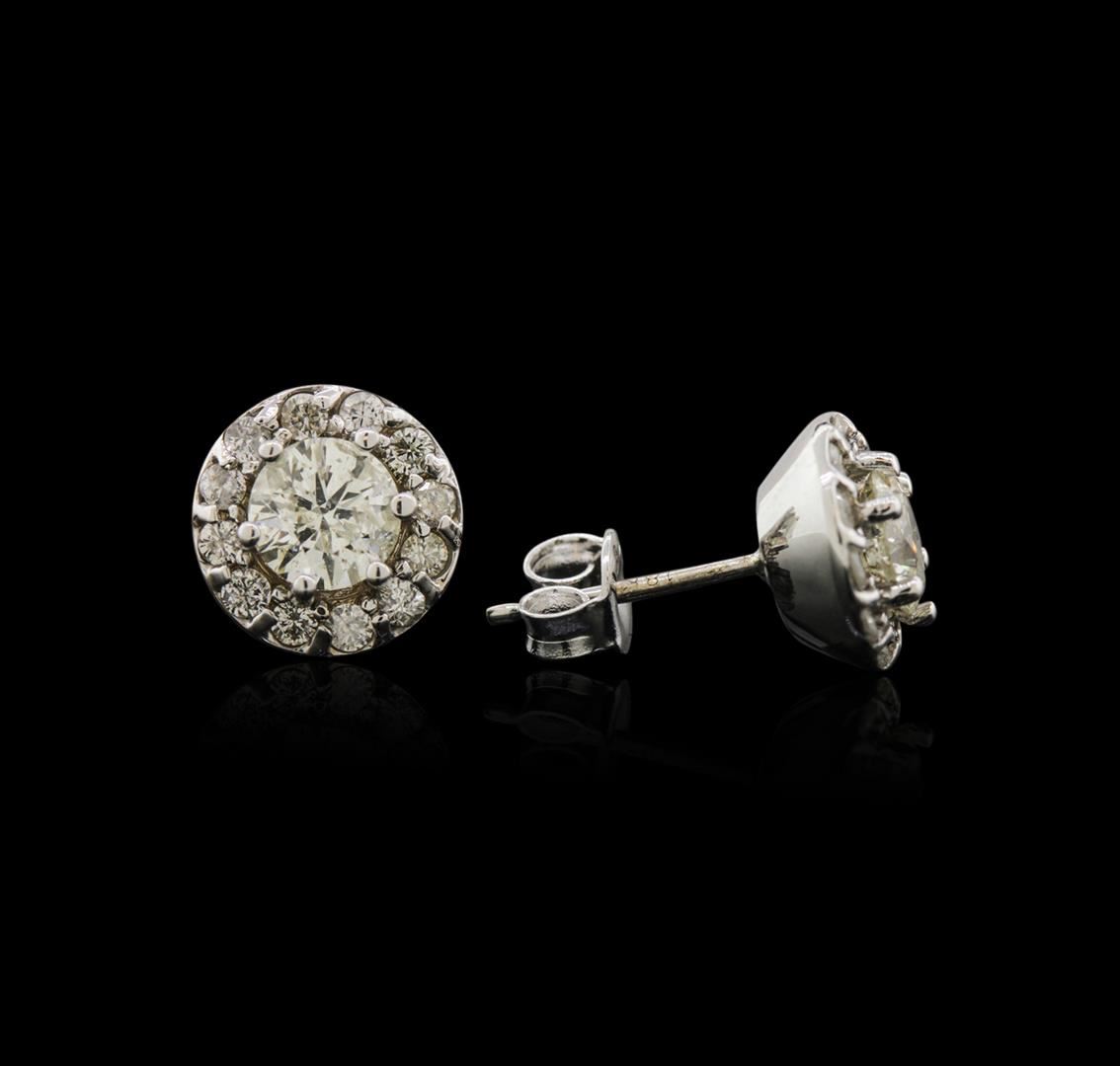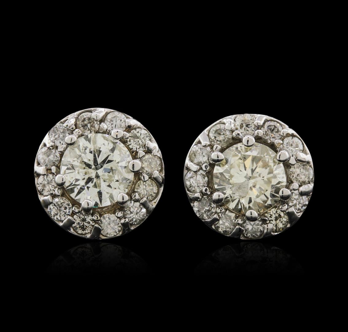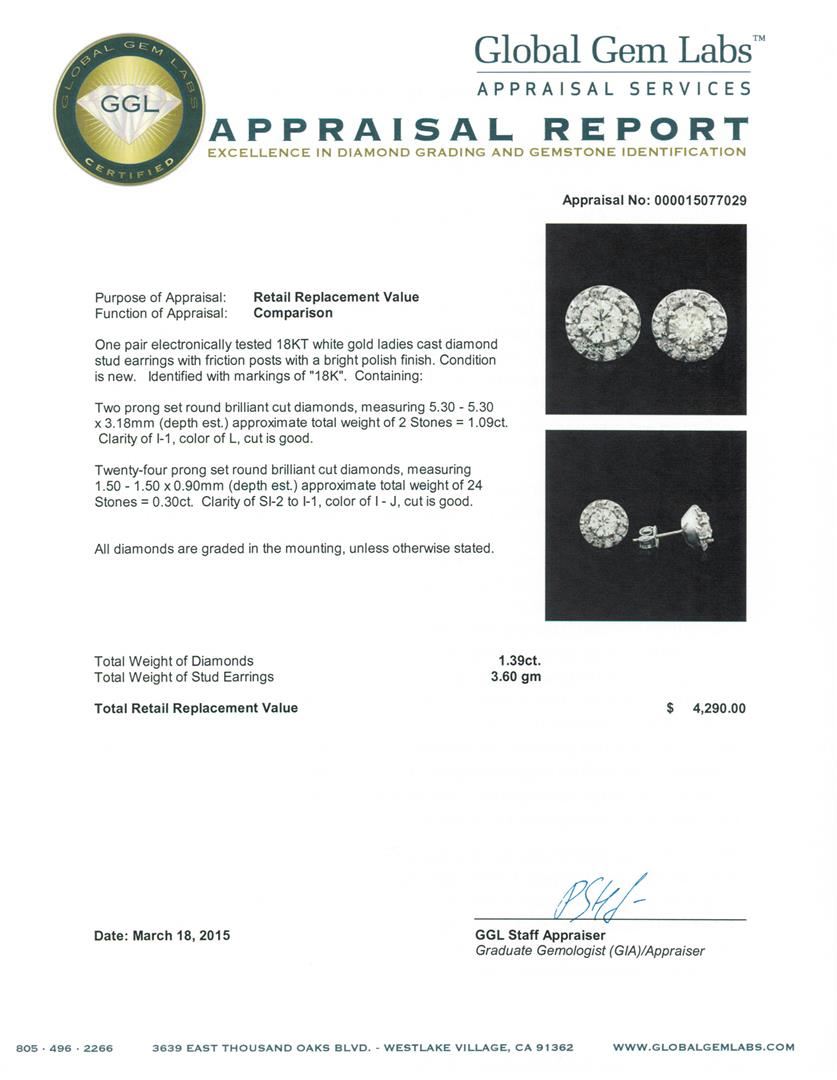 One pair electronically tested 18KT white gold ladies cast diamond stud earrings with friction posts with a bright polish finish. Identified with markings of "18K". Condition is new. Containing: Two prong set round brilliant cut diamonds, measuring 5.30 - 5.30 x 3.18mm (depth est.) approximate total weight of 2 Stones = 1.09ct. Clarity of I-1, Color of L, Cut is Good. Twenty-Four prong set round brilliant cut diamonds, measuring 1.50 - 1.50 x 0.90mm (depth est.) approximate total weight of 24 Stones = 0.30ct. Clarity of SI-2 to I-1, Color of I - J, Cut is Good. All diamonds are graded in the mounting, unless otherwise stated. Total Weight of Diamonds 1.39ct. Total Weight of Stud Earrings 3.60 grams. GGL Appraised at $4,290.00.