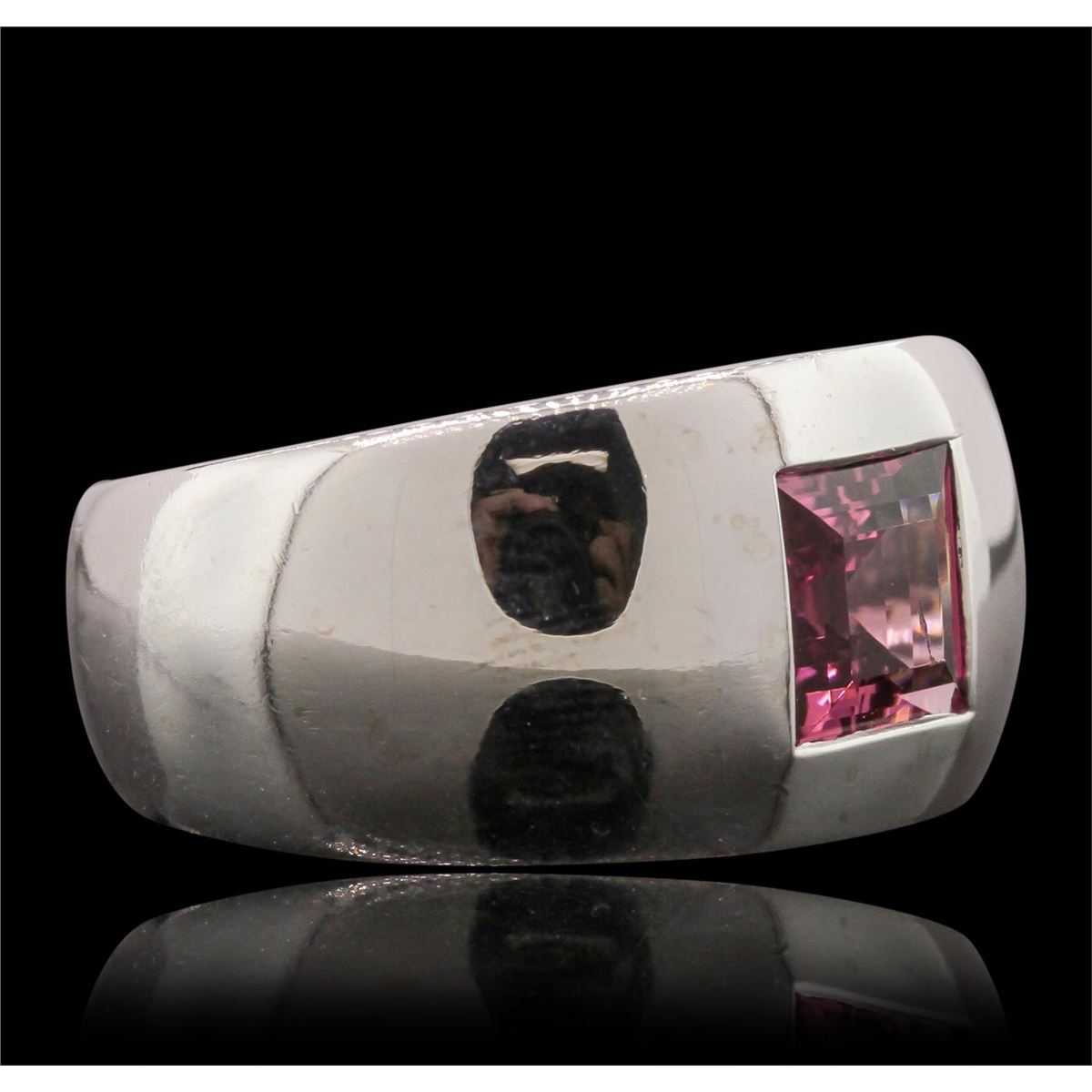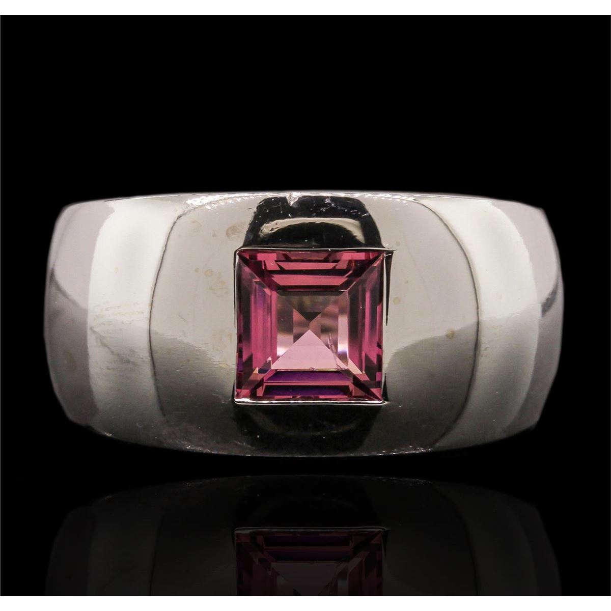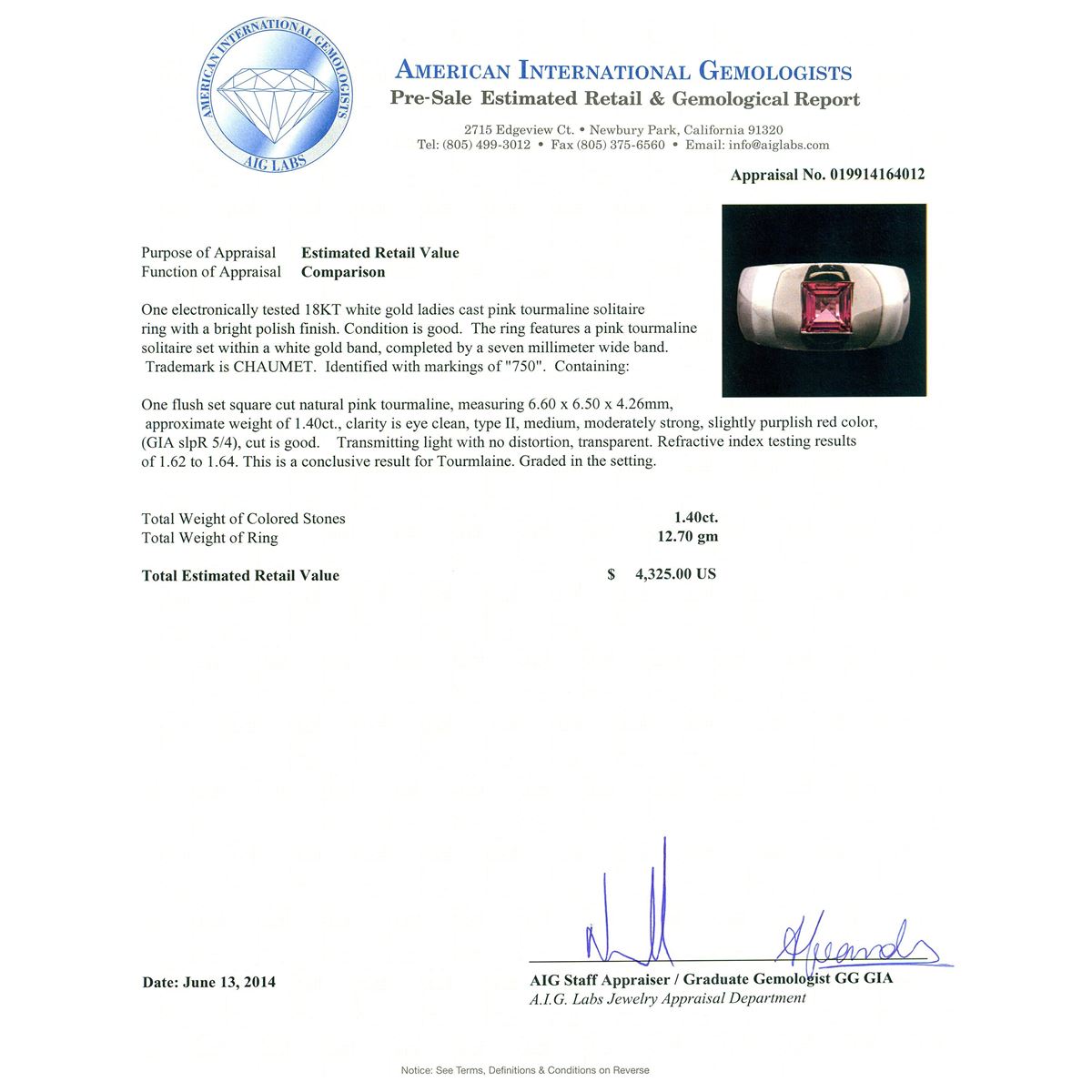 One electronically tested 18KT white gold ladies cast pink tourmaline solitaire ring with a bright polish finish. Condition is good. The ring features a pink tourmaline solitaire set within a white gold band, completed by a seven millimeter wide band. Trademark is CHAUMET. Identified with markings of "750". Containing: One flush set square cut natural pink tourmaline, measuring 6.60 x 6.50 x 4.26mm, approximate weight of 1.40ct., clarity is eye clean, type II, medium, moderately strong, slightly purplish red color, (GIA slpR 5/4), cut is good. Transmitting light with no distortion, transparent. Refractive index testing results of 1.62 to 1.64. This is a conclusive result for Tourmlaine. Graded in the setting. Total Weight of Colored Stones 1.40ct. Total Weight of Ring 12.70 grams. AIG Appraised at $4,325.00.
