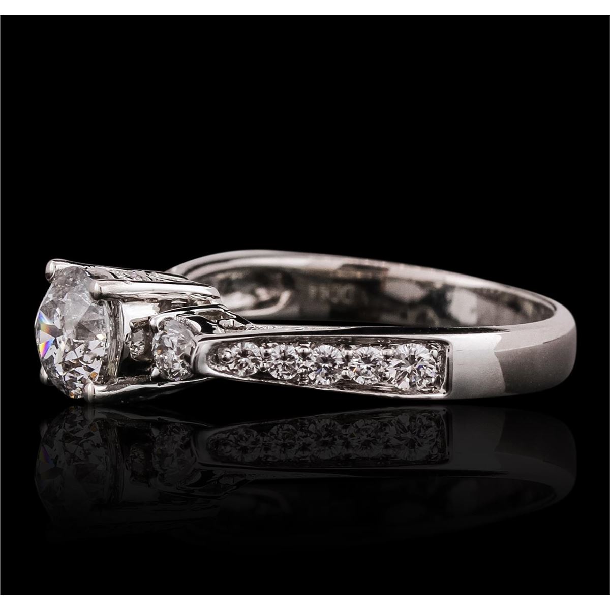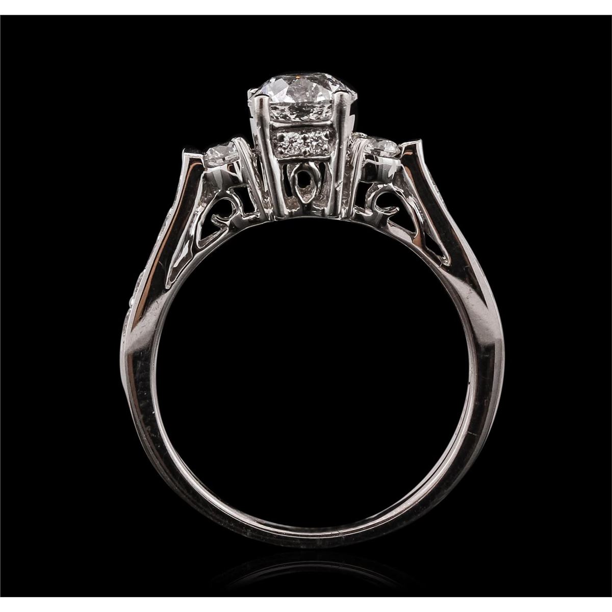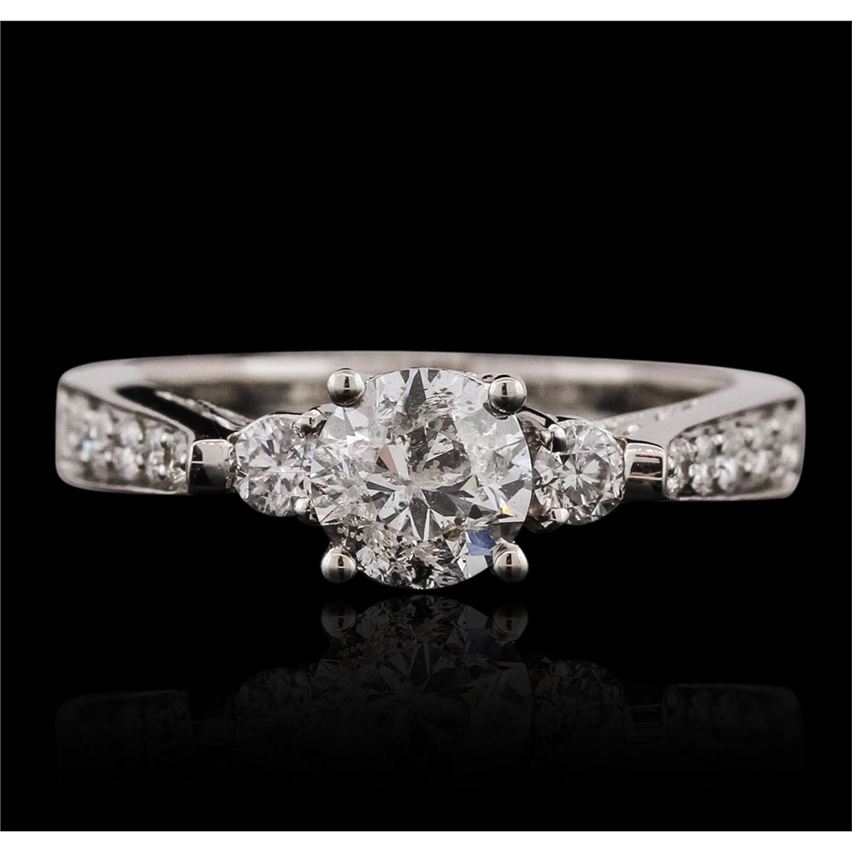 One electronically tested 18KT White Gold ladies cast diamond unity ring with a bright polish finish. The featured diamond is supported by diamond set shoulders, completed by a two and one-half millimeter wide band. Identified with markings of "18K 750". Condition is new, good workmanship. Containing: One prong set round brilliant cut diamond, measuring 5.95 - 5.90 x 3.85mm (depth est.), 4.00.% GTCF approximate weight of 0.96ct with a faint blue fluorescence. Graded in the setting. Clarity: I-2. Color: F. Depth 64.9%. Table 51.4%. Sixteen prong set round brilliant cut diamonds approximate total weight of 16 Stones = 0.44ct. Graded in the setting. Clarity: VS-1 to SI-1. Color: G - I. Total Weight of Diamonds 1.40ct. Total Weight of Unity Ring 4.14 grams. AIG Appraised at $9,875.00.