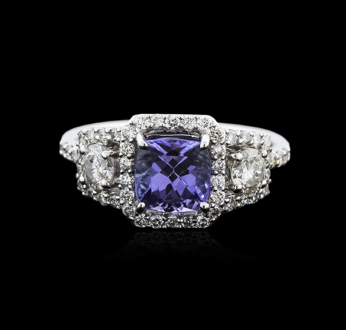 One electronically tested 18KT white gold ladies cast tanzanite and diamond ring with a half round shank with a bright polish finish. Identified with markings of "18K". Condition is new. Containing: One prong set square cushion modified brilliant cut natural tanzanite, measuring 6.50 x 6.50 x 4.23mm, approximate weight of 1.41ct., clarity is eye clean, type I, medium light, very slightly grayish, violet color, (GIA V 4/3), cut is good. Fifty prong set round brilliant cut diamonds, measuring 1.30 - 1.30 x 0.78mm (depth est.) approximate total weight of 50 Stones = 0.40ct. Clarity: SI-2 to I-1. Color: I - J. Two prong set round brilliant cut diamonds, measuring 4.00 - 4.00 x 2.40mm (depth est.) approximate total weight of 2 Stones = 0.47ct. Clarity: SI-2 to I-1. Color: I - J. Colored gemstones are presumed to have been subjected to commonly used enhancement processes. All diamonds and colored gemstones are graded in the mounting, unless otherwise stated. Total Weight of Colored Stones 1.41ct. Total Weight of Diamonds 0.87ct. Total Weight of Ring 3.50 grams. GGL Appraised at $5,130.00.