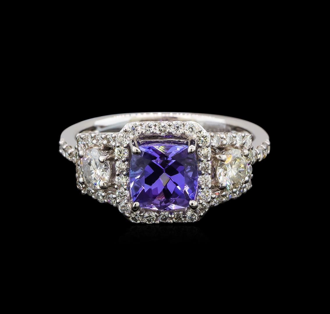 One electronically tested 18KT white gold ladies cast tanzanite and diamond ring with a half round shank with a bright polish finish. Identified with markings of "18K". Condition is new. Containing: One prong set square cushion modified brilliant cut natural tanzanite, measuring 6.50 x 6.50 x 4.23mm, approximate weight of 1.41ct., clarity is eye clean, type I, medium light, very slightly grayish, violet color, (GIA V 4/3), cut is good. Fifty prong set round brilliant cut diamonds, measuring 1.30 - 1.30 x 0.78mm (depth est.) approximate total weight of 50 Stones = 0.40ct. Clarity: SI-2 to I-1. Color: I - J. Two prong set round brilliant cut diamonds, measuring 4.00 - 4.00 x 2.40mm (depth est.) approximate total weight of 2 Stones = 0.47ct. Clarity: SI-2 to I-1. Color: I - J. Colored gemstones are presumed to have been subjected to commonly used enhancement processes. All diamonds and colored gemstones are graded in the mounting, unless otherwise stated. Total Weight of Colored Stones 1.41ct. Total Weight of Diamonds 0.87ct. Total Weight of Ring 3.50 grams. GGL Appraised at $5,130.00.